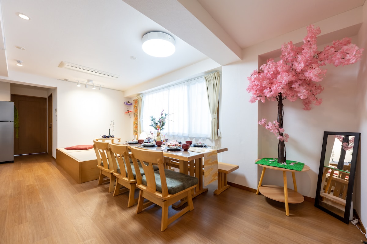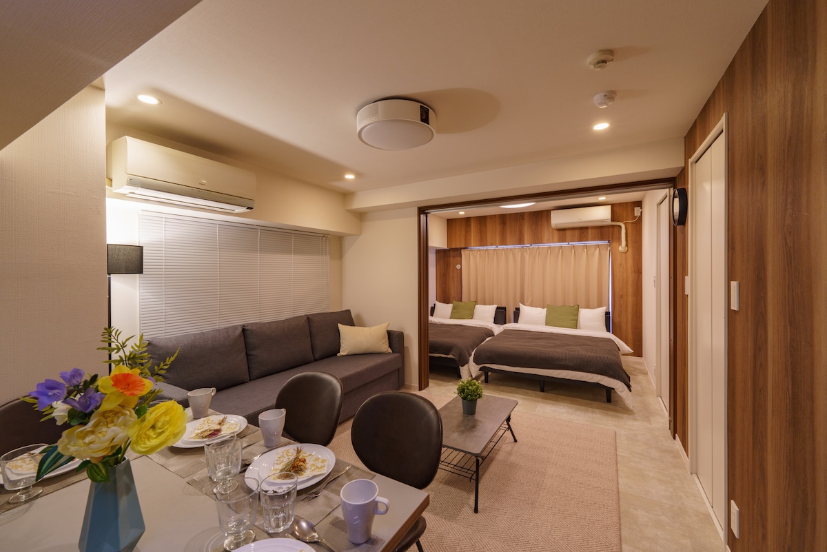 15 min to Shibuya, 22 min to Shinjuku — perfect central Tokyo access! Spacious 1LDK (52㎡) for up to 6 guests, with 2 double beds (140×190) & sofa bed. Renovated bathroom & kitchen for a clean, comfortable stay. Living room with sofa & dining table, also great as workspace. Projector for big-screen viewing — fun even on rainy days. A 30-minute train ride from Haneda Airport, major tourist attractions such as Asakusa and the Skytree are within 30 minutes.