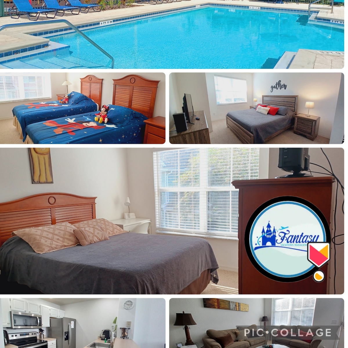 Gyönyörű 3 hálószobás, 2 fürdőszobás teljes lakás zárt közösségben, gyönyörű medencével a floridai Kissimmee-ben. Mindössze 10 percre van a legtöbb vidámparktól. Szállj meg szép, békés és otthonos lakásunkban, miközben élvezed Orlando, Florida szépségét és a Disney parkok vidámságát. Élvezd tágas hálószobáinkat, szórakoztató szolgáltatásainkat minden helyiségben (Netflix, Disney+, Roku is benne van), a Wi-Fi-t és a teljesen felszerelt konyhát.