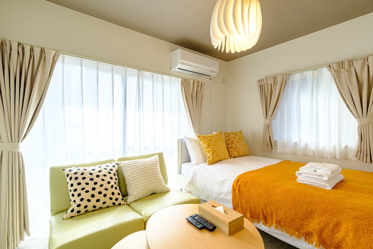 Just a 2-minute walk from the station, Palette House is a cozy and stylish retreat perfect for exploring Tokyo. The industrial-style kitchen includes an island bar, full cookware, wine glasses, and a water dispenser—ideal for cooking and evening drinks. The living room features natural driftwood décor and a comfy sofa, while the Japanese-modern bedroom offers a refined, relaxing space. With thoughtful amenities and warm design, it’s a perfect base for couples and families.