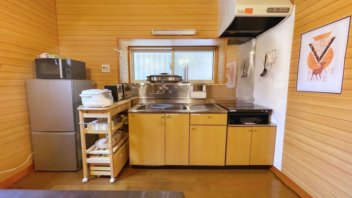 This is a modern, fully-furnished house with an open plan kitchen and dining room and large floor length windows with beautiful mountain views. Sleeping space has Japanese style mattress Amenities include shower, toilet, TV, fridge, air conditioner, and wifi.