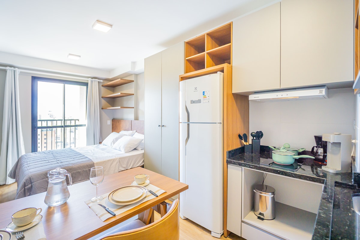 Építészek által tervezett stúdió Curitiba szívében. Teljesen berendezett modern és kortárs dekorációval, csúcsminőségű készülékekkel és kifogástalan felületekkel. Legfeljebb 3 fő elszállásolható egy kétszemélyes ágyon és egy egyszemélyes ágyon. Teljes konyha, nagy sebességű Wi-Fi, okostévé és légkondicionáló. Tökéletes a munkához vagy a szabadidő eltöltéséhez. Kiváltságos elhelyezkedés a központban, közel mindenhez. Élvezd a kiváló vendégélményt egy egyedi és kifinomult helyen! A zuhany tökéletes😍
