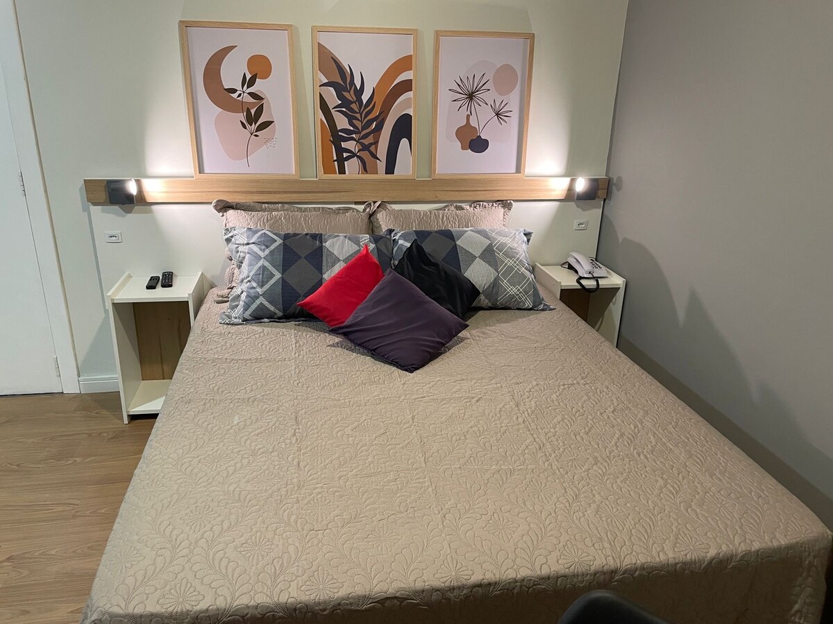 Kényelmes stúdió akár 2 fő számára, Curitiba belvárosában, a Major Couto Pereira stadion, a buszpályaudvar és a városi piac közelében. Ideális turistáknak, utazási szakembereknek vagy orvosi kezelésen átesett betegeknek. Gyors Wi-Fi-vel és hangulatos légkörrel büszkélkedhet. Érkezés 14:00-kor, távozás 10:00-kor, a vendégek érkezése és távozása között pedig szünet van a takarításra. Korai érkezés vagy késői távozás? Foglald le az extra éjszakát a nagyobb kényelemért.