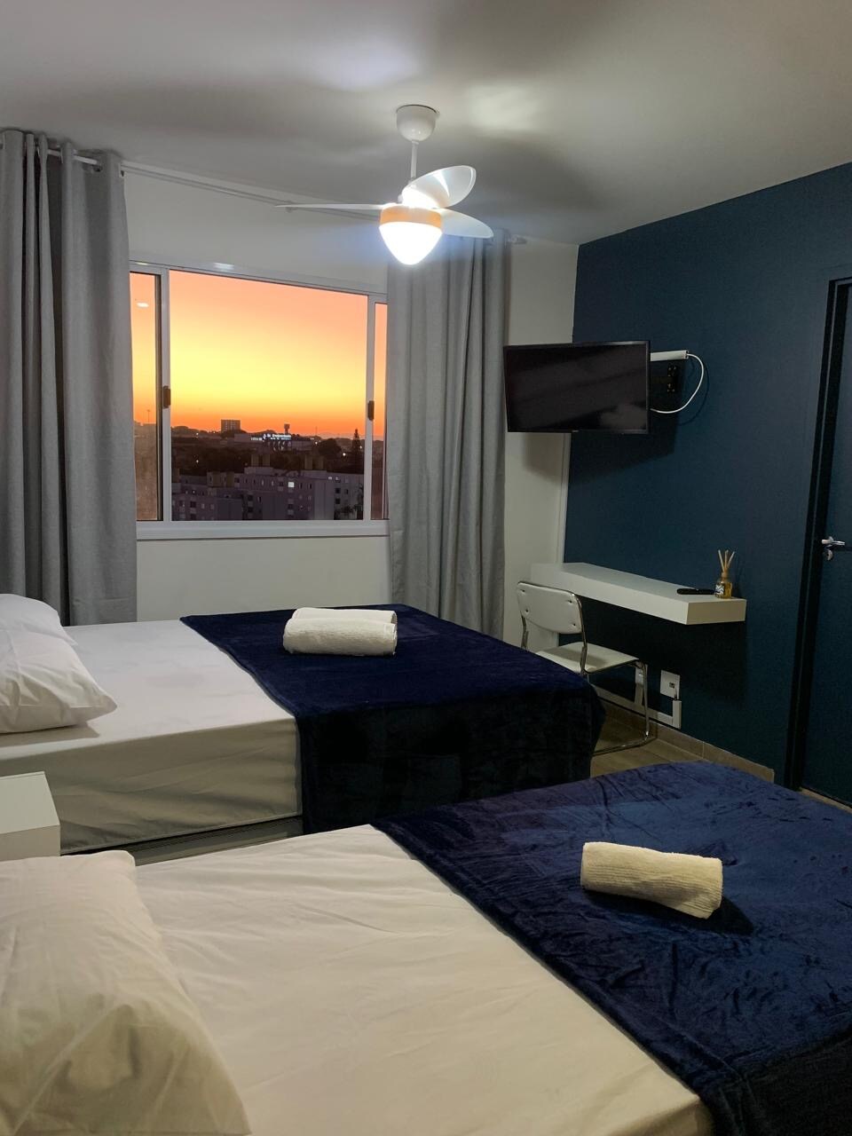 Integrated bedroom and kitchen, individual hot tub, air conditioning, internet, space with upper single bunk bed and double bed, even compact, pleasant and family-friendly, optimized for your well-being. Kitchen items (pots, plates, cutlery, glasses), iron, hairdryer, bed linen and towels. Gym, grocery store, games room. Check-in at any time due to electronic lock. Nearby: 10 minutes from Neo Química Arena Stadium, Santa Marcelina Hospital, Guarulhos International Airport