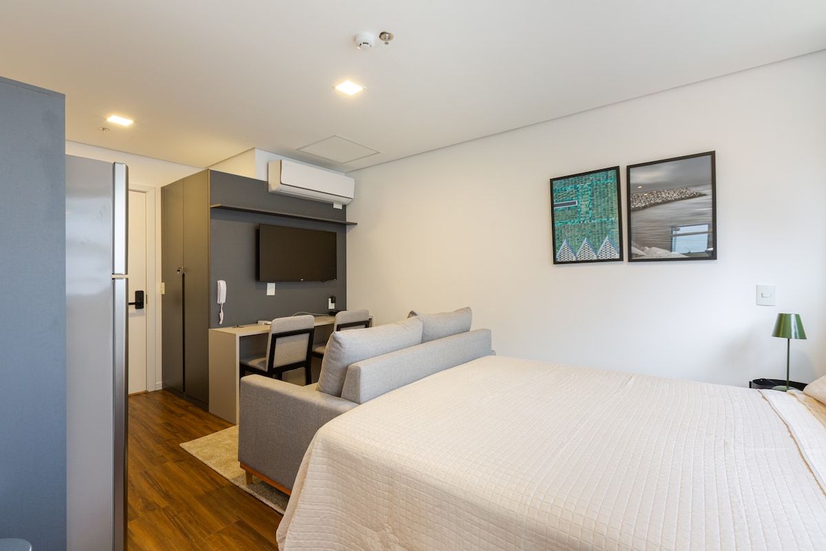 Modern stúdió a Condomínio ID Lisboában, Vila Mariana. Kétszemélyes ággyal, konyhával, fürdőszobával, Wi-Fi-vel és íróasztallal rendelkezik. Társasház edzőteremmel Companhia Atlético, terasz, coworking és mosási lehetőségek. Kiváló elhelyezkedés: az Ibirapuera Park, a São Paulo és az Edmundo Vasconcelos kórházak és a metró közelében. Ideális szabadidős vagy üzleti utazásokhoz egy kávézókkal és üzletekkel teli környéken.