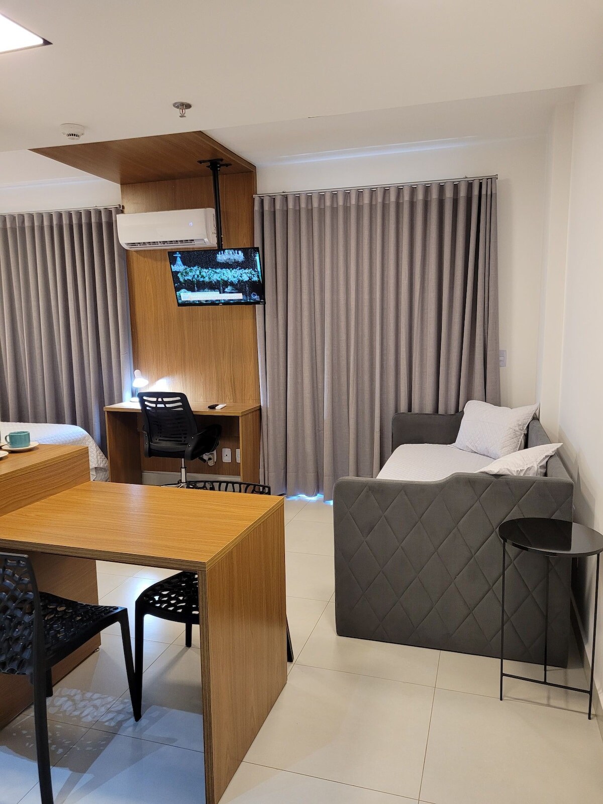 Gyönyörű lakás Ribeirao Preto szívében, erkéllyel , hálószobával, fürdőszobával , ínyenc hellyel és élettel . A hálószobában és a nappaliban, a tűzhelyen, a mikrohullámú sütőben, a minibárban ,a nagy sebességű (távoli munka) síkképernyős TV-vel, a kábel-TV-vel és a felszerelt konyhával rendelkezik. 24 órás portaszolgálat,parkolás beltéri garázsban, edzőterem ,úszómedence ,szauna és éttermi szolgáltatás. A nap nem tartalmazza a reggelit. Az épület konferenciával és tárgyalóval is rendelkezik (a szolgáltatást nem tartalmazza ).