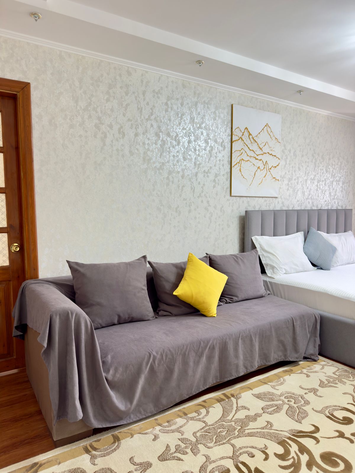 Az apartman két szobából áll. Európai felújítás. Központ. Minden kényelmi szolgáltatással rendelkezik. A közelben található egy teniszpálya, az Abay Park, a Fontan Water Park. A Wi-Fi ingyenes. Teljes dokumentumcsomagot biztosítunk.