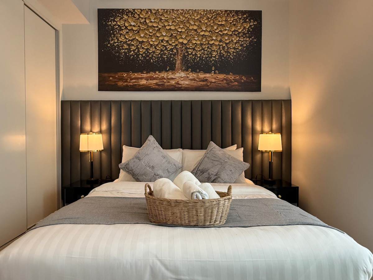 Spacious 62sqm pet-friendly suite, featuring a large balcony! Designed with an open living space that includes a smart TV, working area, 4-seat dining table, and fully equipped kitchen. The bedroom boasts a king-sized bed, another smart TV, powder area, and walk-in closet for your comfort. Both the living and bedroom provide access to the 4-fixture bathroom, which includes a relaxing bathtub and shower.Enjoy amenities such as swimming pool, gym and complimentary shuttle service during your stay!