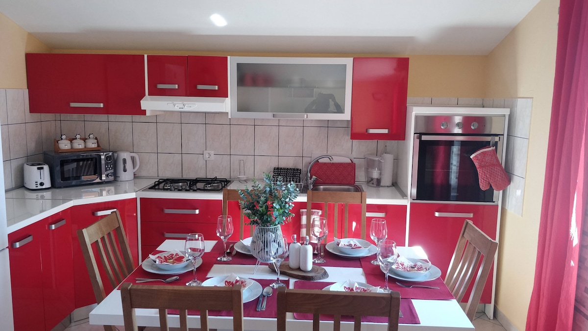 This brand new house built June 2022 is a joy to behold! It accomodates 5 people and offers a 25square meters swimming pool and a jacuzzi. You can boast with your BBQ skills on the outside terrace; or show the world how good you are playing FIFA on PS5 inside the house. For those rainy nights- we recommend Netflix and chill on our 65” TV. Situated in a quiet neighbourhood 20min drive from hustle and bustle of Split. Are you ready to be our first guests?
