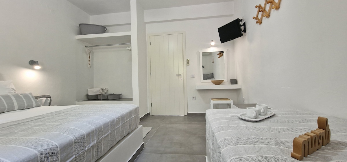 The junior suite is designed with an open plan lay out and features 1 bedroom withdouble bed, sitting area with sofa, 1 bathroom with walk in shower, private balcony overlooking the Aegean Sea and the famous monastery of Chrysopigi offering total relaxation and calmness. This unit is spacious, modernly decorated with details of Cycladic ambience and can accommodate up to 2 guests.