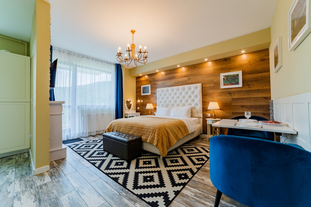 Luxus apartman, hangulatos, modern, barátságos és nagyon barátságos, Sinaia belvárosában található, nagyon közel az éttermekhez és az összes nevezetességhez, gyönyörű kilátással a Bucegi hegyekre és a Cota 1400. Tartalmazza az Otthon által igényelt kényelmi szolgáltatásokat és kényelmi létesítményeket.
