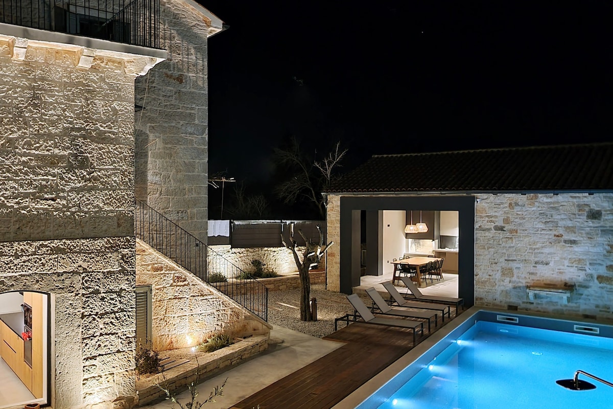 Autentikus isztriai kőház, amely 1922-ben épült. Ez a ház teljesen felújított és felszerelt, hogy mindent biztosítson, amire szükséged van. Modern belső tér, teljesen felszerelt konyha, pihentető nappali, tágas hálószobák saját fürdőszobával, szabadtéri étkezőhelyiség grillezővel, saját medence és parkolás az ingatlanban. Minden szobát tervezőnk gondosan megtervezett. Mindez lehetővé teszi, hogy élvezd az ünnepeket, és megtöltsd az elemeket.