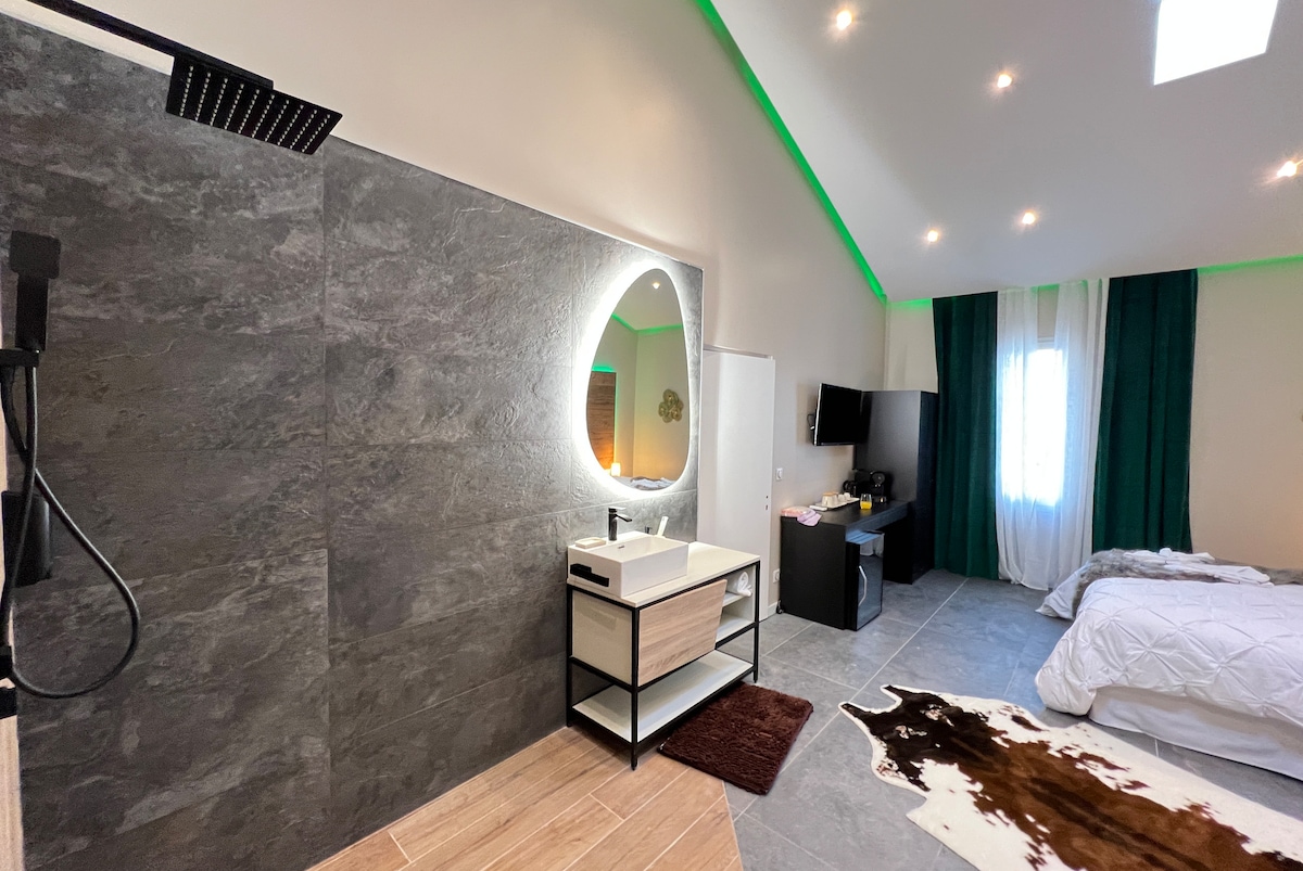 Kényeztesd magad egy romantikus kiruccanással néhány percre Aubagne-tól. Ez a pezsgőfürdős lakosztály meghitt légkört kínál két személyes pezsgőfürdővel, queen méretű ággyal, lágy világítással és Netflix-szel. Élvezd a pihentető szállást minibárral, reggelivel vagy étkezési lehetőségekkel. Tökéletes egy romantikus éjszakához, egy meglepetésszerű kiruccanáshoz vagy egy wellnessszünethez. Önálló bejutás, nyugalom és teljes magánélet garantált.