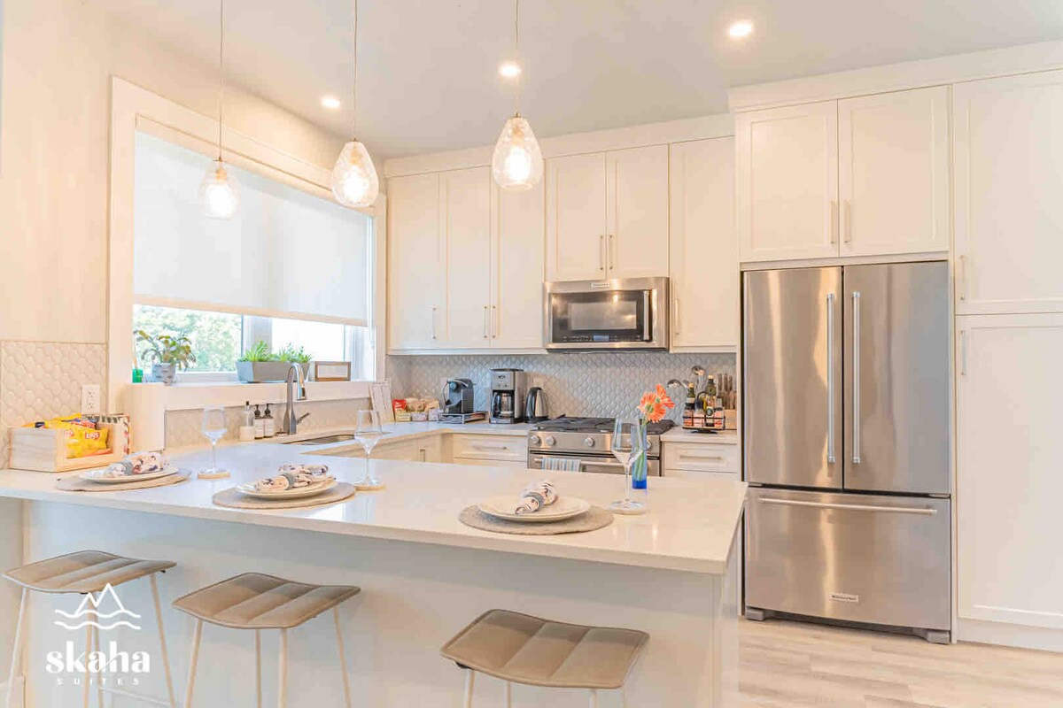 SKAHA SUITES A luxurious carriage house on a great beachfront property, situated on Skaha Lake. One step to Skaha Park where you would find a marina, kids water park, beach volleyball, & basketball. You will be assigned at MACTAN ISLAND SUITE that has 2 bedrooms w/ deluxe queen beds, one bathroom w/ a shower, washer/dryer, kitchen, oven, fridge, dishwasher, & microwave. The living room has a pullout couch that could sleep two.