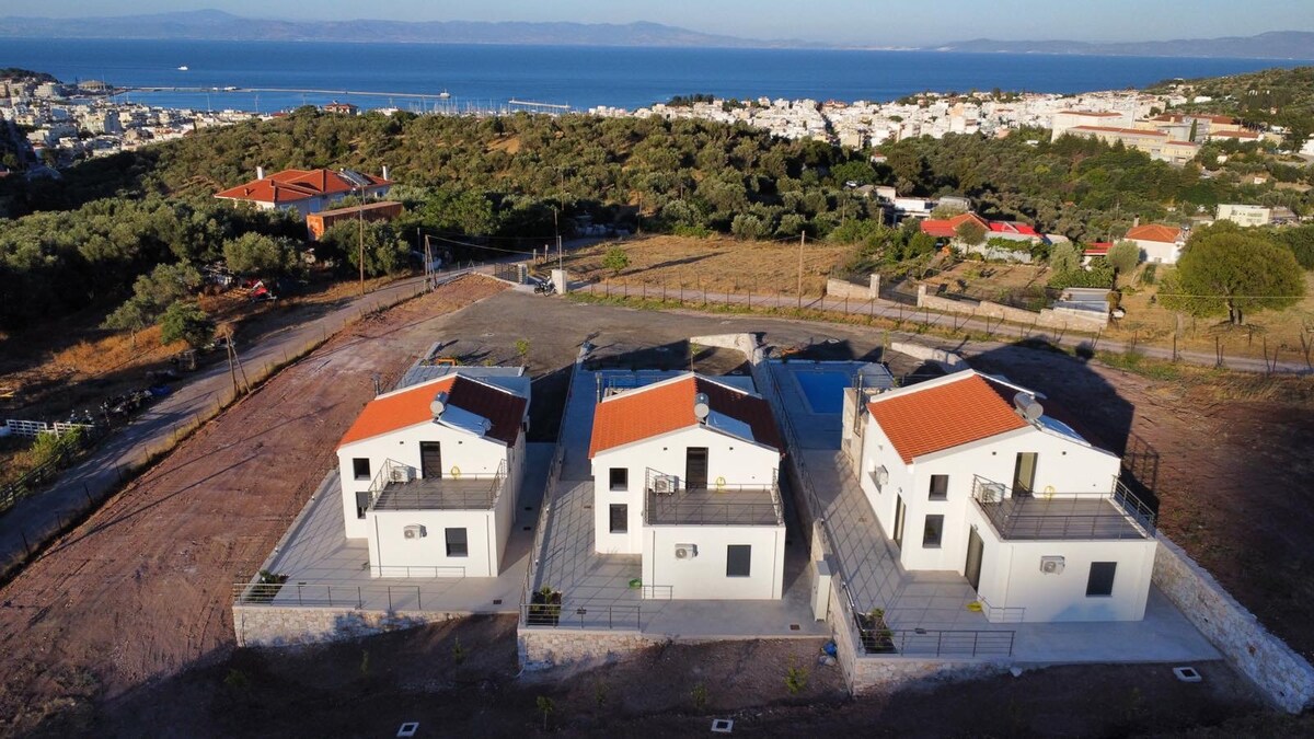 Luxus 120 m2-es kétszintes ház saját medencével és kilátással a Gera-öbölre, 100 m-re a tengertől. Két hálószobája, pezsgőfürdős fürdőszobája, wc-je, központi légkondicionáló rendszere, padlófűtése és Wi-Fi-je van. Egy olajfaligetben épült, parkolóval rendelkezik, és 5 km-re található Mitilén városától, a repülőtértől és a kikötőtől. Haramida és Agios Ermogenis híres strandjai 5 km-re találhatók.