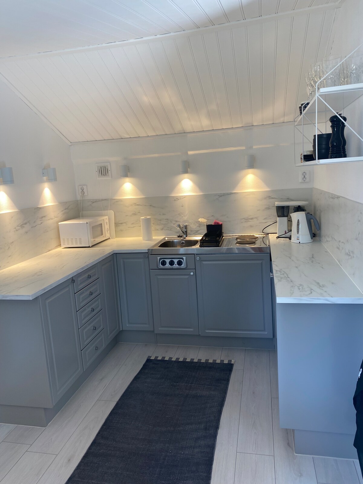 Guest cottage with a quiet and beautiful beach just outside the property, 50m from the front door! Cottage has a comfortable kitchen with seating, a combined bedroom/living room and a newly renovated bathroom with rain shower. Inside is 28sqm, and also has an outside patio exclusively for guest use. BBQ, garden furniture and beach chairs available during summer Note Please bring your own bed linen and towels. You clean yourself after your stay