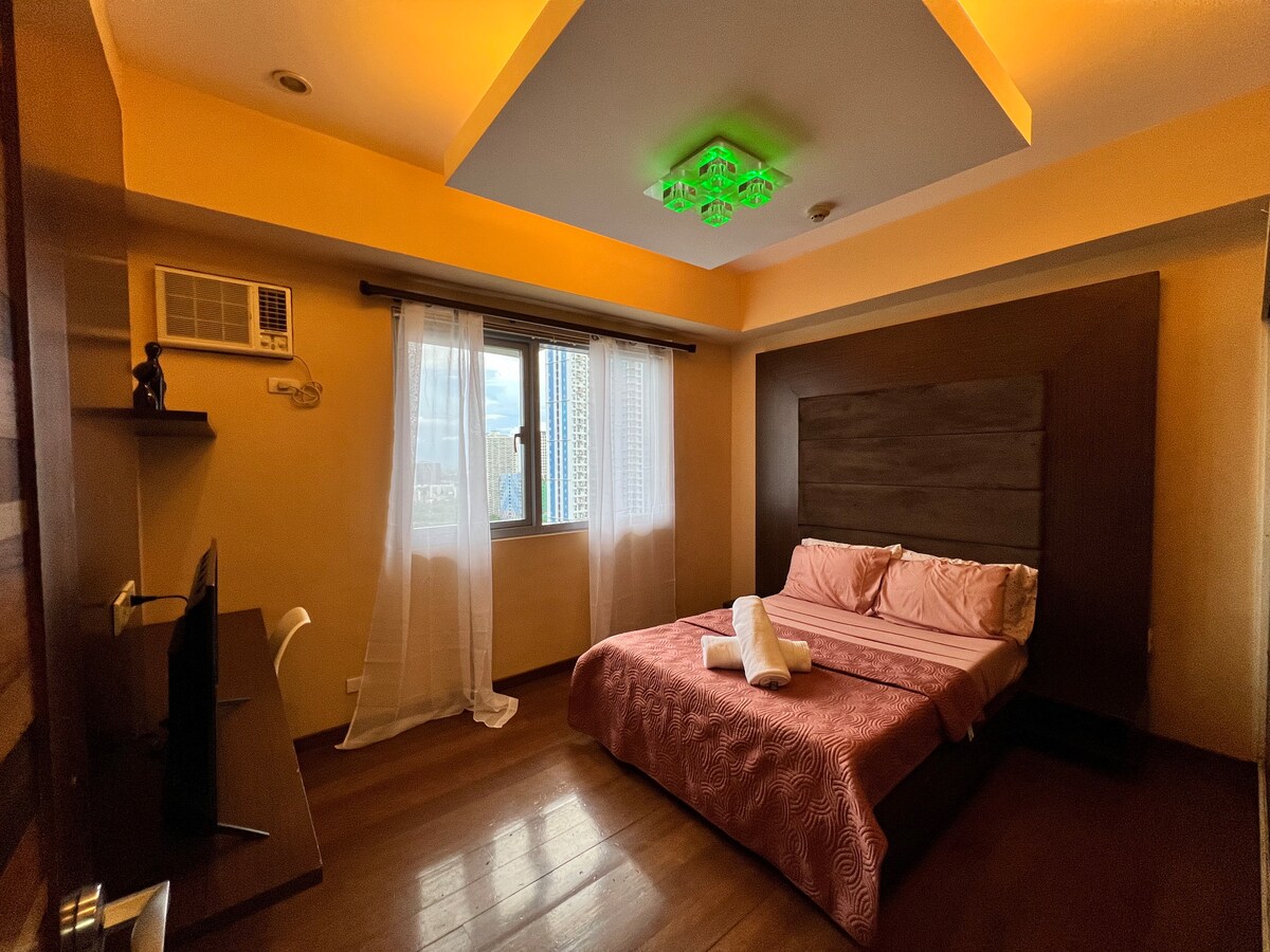 The whole group will enjoy easy access to everything from this centrally located place. Our freshly renovated unit features a spacious living area, a comfortable dining space, and a well-equipped kitchen—perfect for families or groups of friends. The master bedroom includes an en-suite bathroom and a large window with a stunning city view. Everything you need is just a few steps away, including banks, restaurants, convenience stores. Near SM Aura, Bonifacio High Street & Mind Museum.