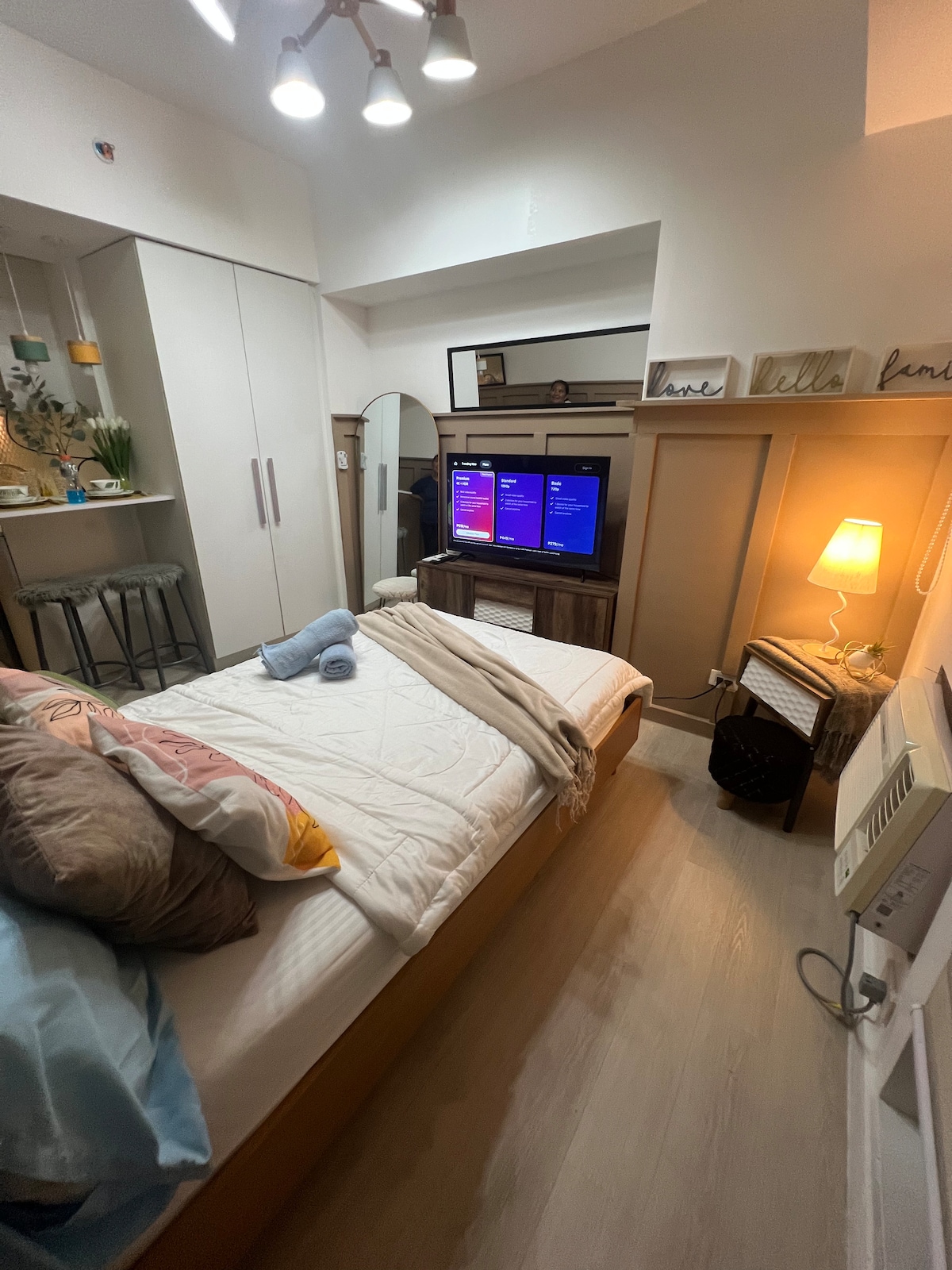 Stílusos és hangulatos lakás San Fernando szívében, nyugodt hangulattal és erkély, kilátással a Mt. Arayat és a város látképe. Tökéletes egyedül utazóknak vagy pároknak, a szállás kényelmes ágyat, kanapéágyat, nagy sebességű Wi-Fi-t, 55 hüvelykes TV-t Netflix-szel, mini karaoke-t, társasjátékokat és teljesen felszerelt konyhát kínál. A vendégek nyugodt környezetben pihenhetnek és lazíthatnak, miközben kényelmesen közel vannak a bevásárlóközpontokhoz, üzletekhez, kávézókhoz és helyi látnivalókhoz. Ideális választás rövid látogatásokhoz és hosszabb távú foglalásokhoz is.