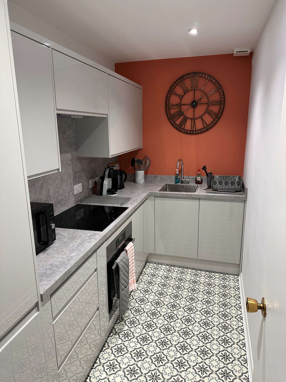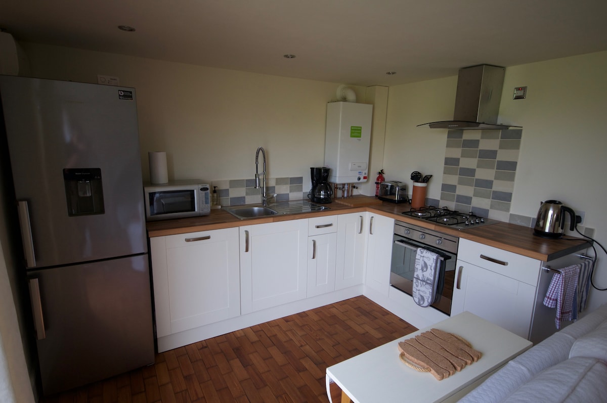 The accommodation was once a barn dating back to 1900. It is a contemporary conversion within the rear garden of the main house. The property incorporates everything needed for a great stay. It is completely private and self-contained. The ground floor consists of an open plan living room/kitchen and is accessed by two large patio doors. A staircase leads to a light and airy bedroom with a king size bed, drawers and a wardrobe. There is an en-suite bathroom with walk-in shower.