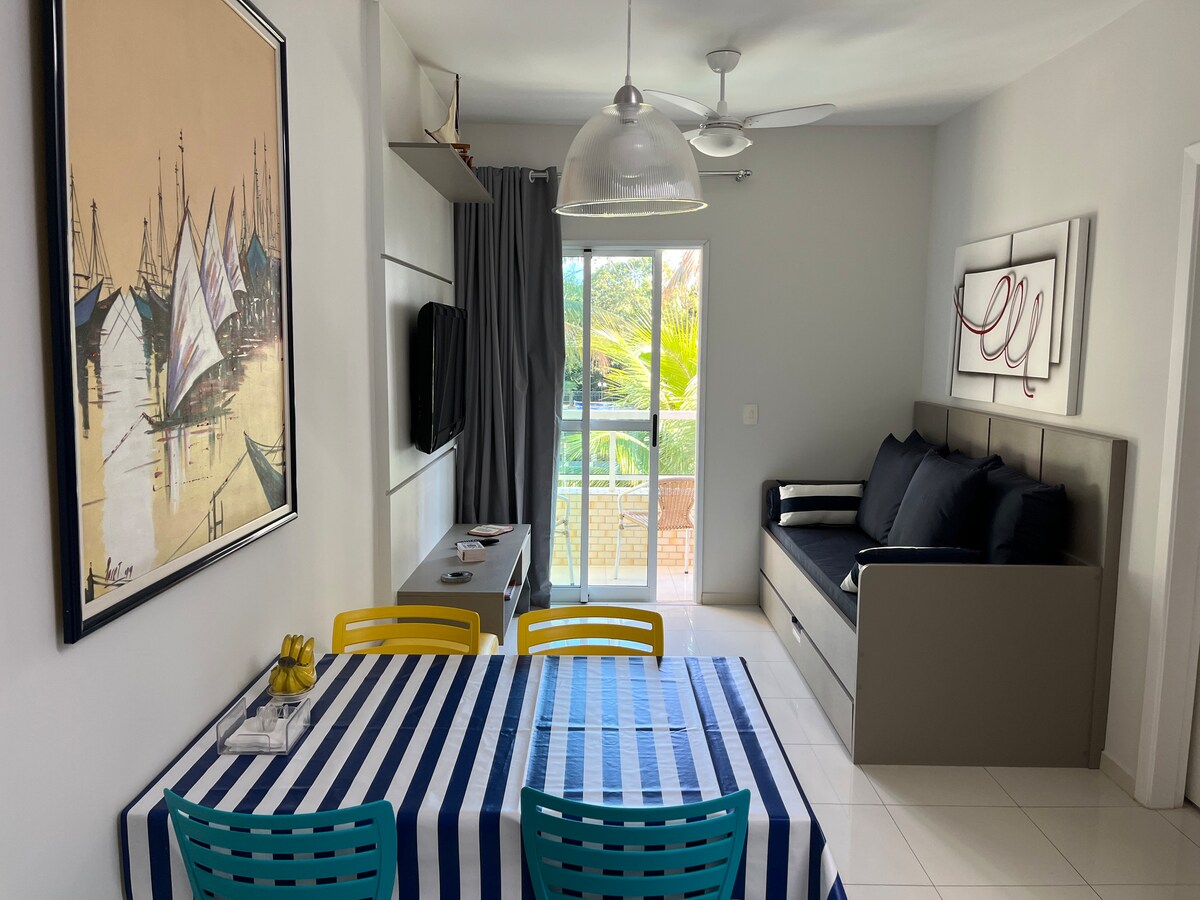 Apartamento charmoso e bem localizado, ele possui 3 quartos ( 1 suíte) e acomoda 7 pessoas. Está localizado a 150m da praia ( possui serviço de praia) e está a 10 min a pé do shopping.Vc terá televisão streaming, TV aberta e Wi-Fi , duas vagas para carro, sauna , churrasqueira , sala de jogos , quadra poliesportiva ( futebol e tênis) , 2 piscinas de adulto ( sendo uma climatizada) e uma infantil, brinquedoteca, academia, sala de tv , área gourmet e maquina de gelo.