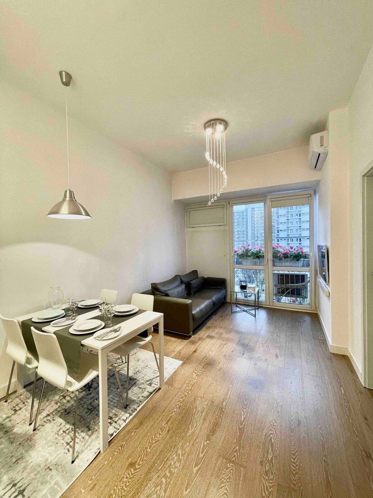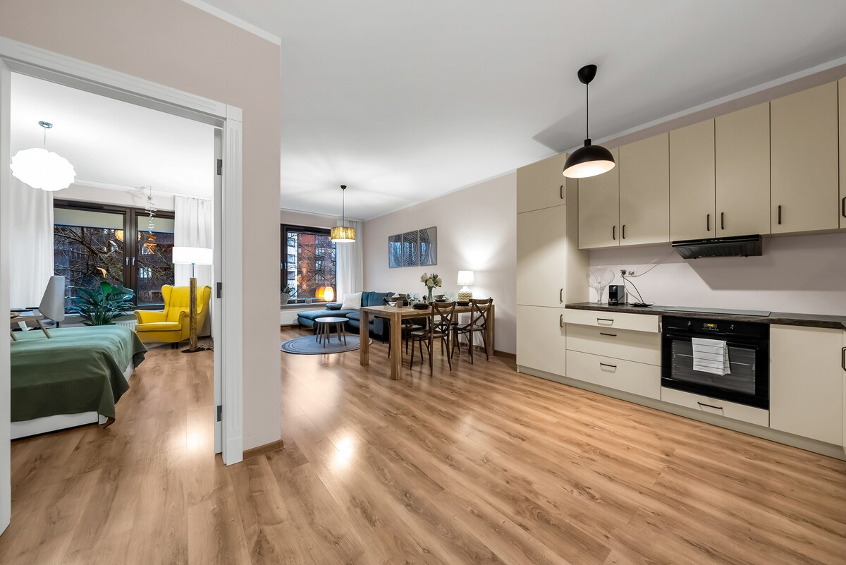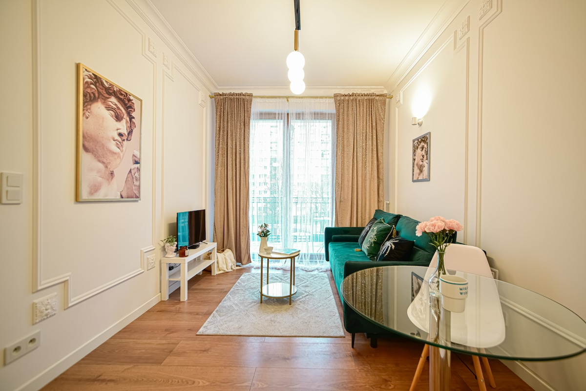 Egy lakás a városközpontban, Varsó ikonikus pontjainak pufferzónájában. A 84 m2-es lakás egy nappaliból, egy konyhasarokból, 2 hálószobából és 2 fürdőszobából áll, zuhanyzóval és káddal. Hangulatos lakáselrendezés és átfogó felszereltség a szükséges konyhai készülékekkel és kiegészítőkkel, síkképernyős tévével és wifivel a kényelmes tartózkodás érdekében. Az épületben van úszómedence és fitneszterem, amely kizárólagosan lefoglalható. A parkolóhely a mélygarázsban található.