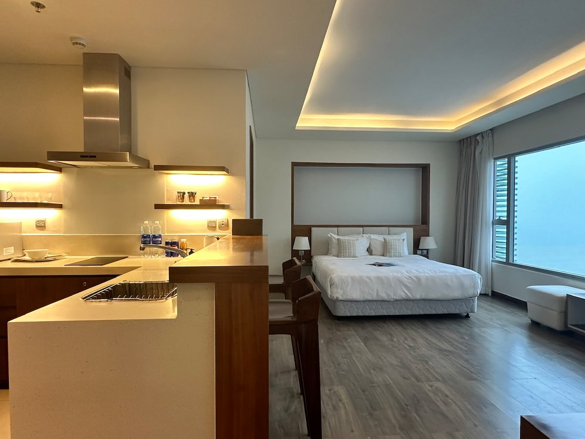 Căn hộ Alacarte 1 phòng ngủ trực diện biển “Lựa chọn lý tưởng cho cặp đôi hoặc kỳ trăng mật ngọt ngào” Thức dậy chào ánh dương và lắng tai nghe lời ca từ biển cả chính là cảm giác tuyệt vời khi lưu trú tại căn phòng này. Căn hộ Alcarter 1 phòng ngủ trực diện biển, với ban công siêu rộng ngắm nhìn đại dương mênh mông. Căn hộ 1 phòng ngủ với khu vực phòng khách, phòng ngủ và bếp riêng biệt. Tất cả các phòng này đều có ban công ngắm biển và phòng tắm tiện nghi cùng với bồn tắm và vòi sen