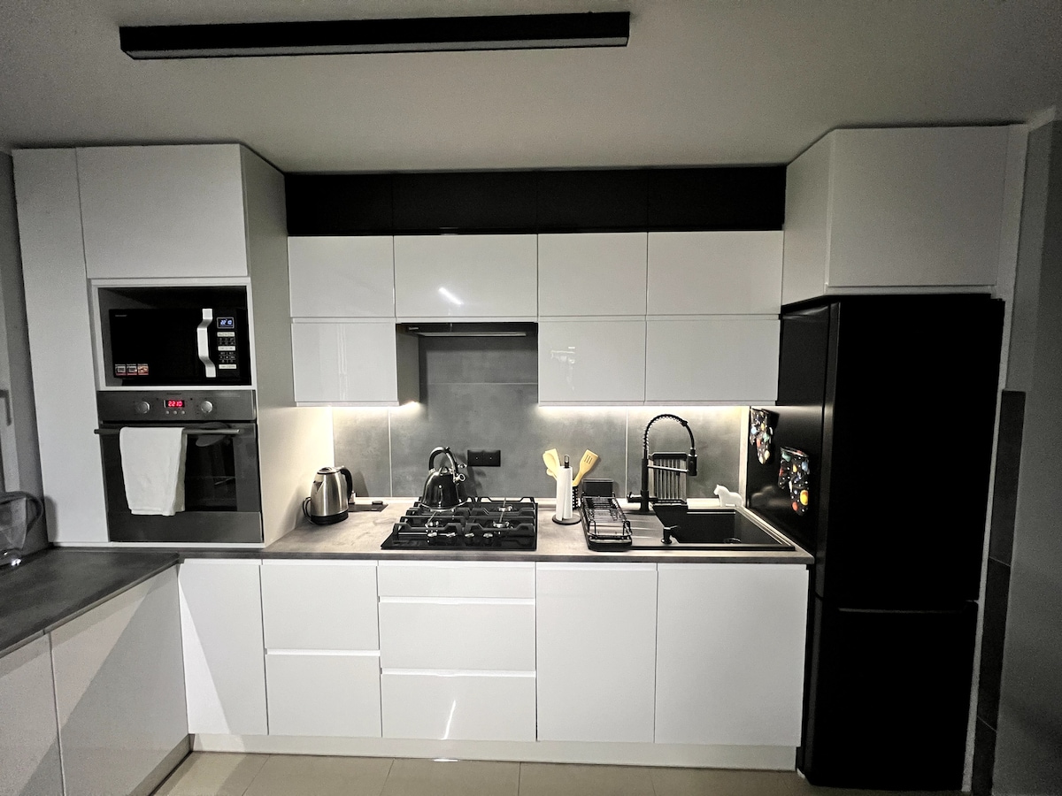 Független, modern, 45 m2-es apartman. Nappali, hálószoba, konyha és fürdőszoba. A lakás 2018-ban teljes felújításon esett át. 4 fő elszállásolására alkalmas két szobában: a hálószobában (2 ágy: 160x200 és 90x200) és a nappaliban egy kanapén. Teljesen felszerelt konyha. Kényelmes zuhanyzó üveggel elválasztva. Mosógép, kozmetikai szekrény. Törölközők, alapvető kozmetikumok. Kellemes és hangulatos mind az üzleti, mind a turisztikai utazók számára. Transzfer a repülőterekről az egész országban.