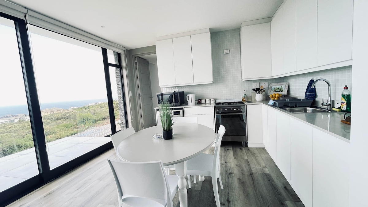 Éld át a tengerparti életmódot a sziklák tetején található luxusotthonunkban, amely minden szobából lenyűgöző kilátást nyújt az óceánra. Organikus, modern dizájnunk természetes fát és dizájner puha bútorokat tartalmaz. Merülj el a félig fűtött medencénkben, vagy élvezd a jóga- és pihenőteraszunkat, vagy főzz egy ételt a dizájner konyhánkban. Napenergiával működő rendszerrel és egy privát természetvédelmi területen. Csak 25 percre a George repülőtértől, 15 percre a Garden Route Malltól és Wilderness-től. Lazíts kényelmesen és stílusosan.