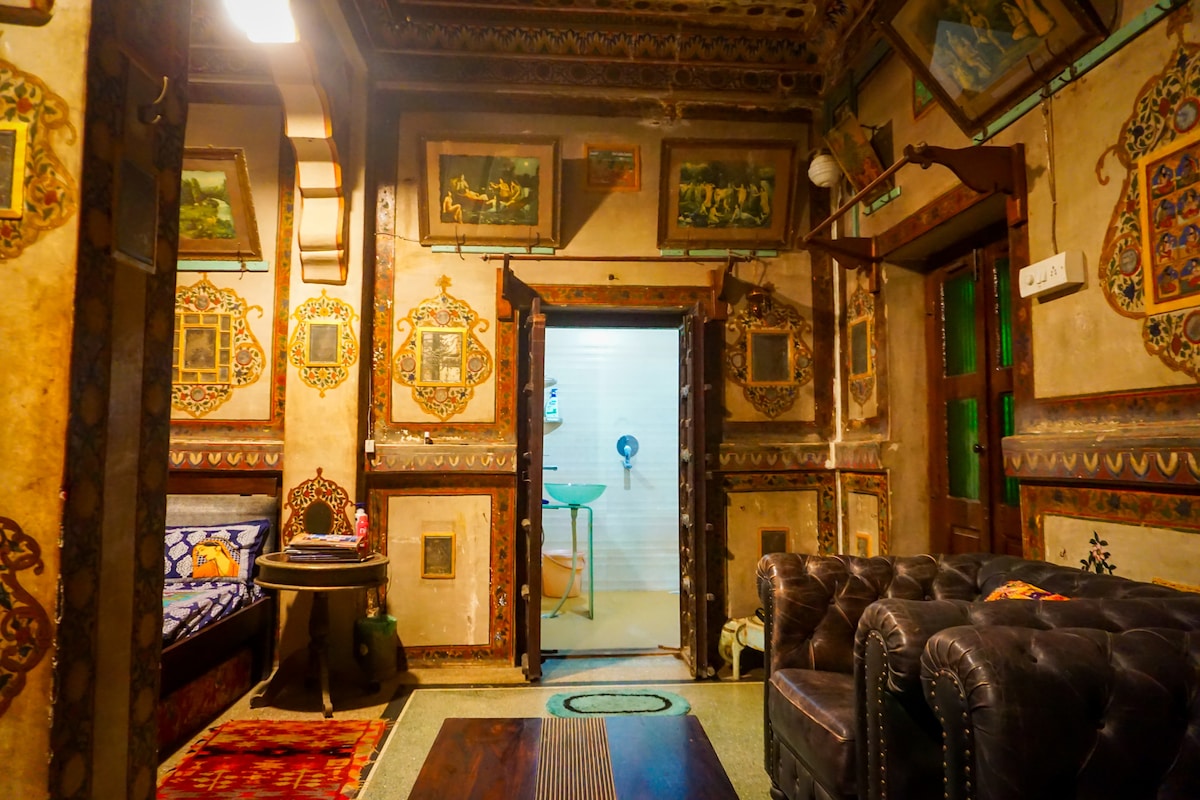 This palace room was constructed by the great architects of the royal family of jodhpur in 1800s . This room has been kept intact for centuries . Full of beautiful vegetable paintings and epics of Hindu mythology, you can explore the history inside . This room is located close to the temple and is said to be full of positive energies (thus there are some house rules too ). it has got an attached bathroom with all the necessary amenities. This place is located right at the city center .