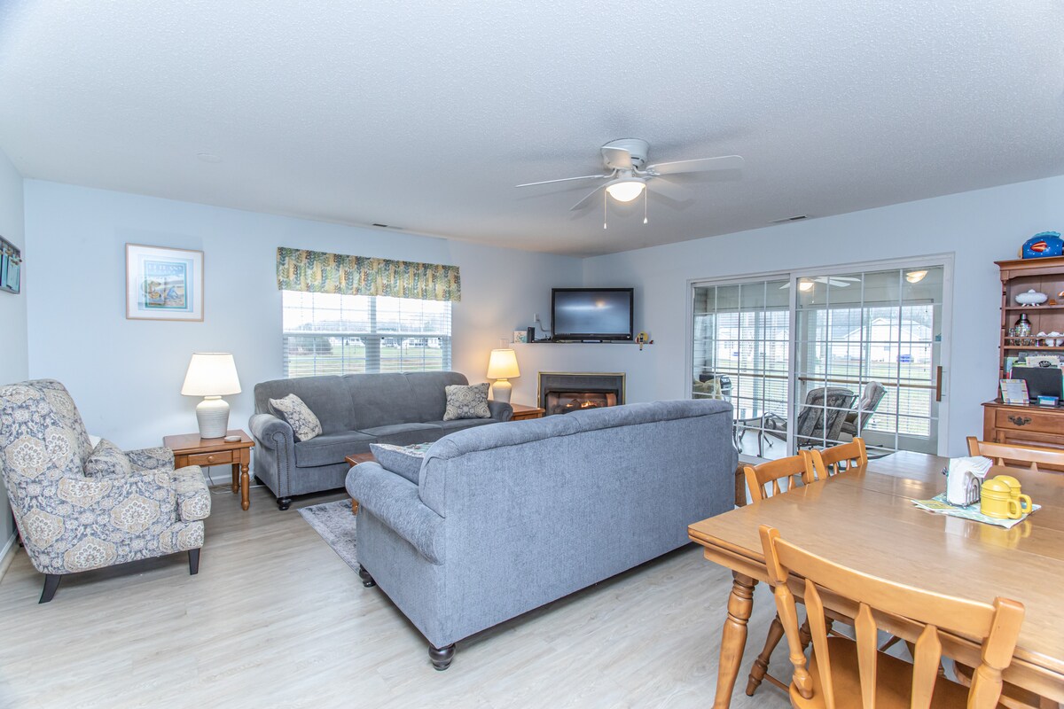 2 miles from the beach in a complex called Mallard Lakes in Fenwick Island, DE.Close to great views, restaurants, beach, and family activities.Bird watching outside screened-in porch, fishing, crabbing, two outdoor pools/hot tub (open Memorial Day-Labor Day), tennis, volleyball and basketball courts, tot lot, horseshoe pit, shuffleboard, grilling area and a shopping center across the street.Free water aerobics, outside shower, fireplace, umbrella and chairs for beach, comfortable sofa bed.