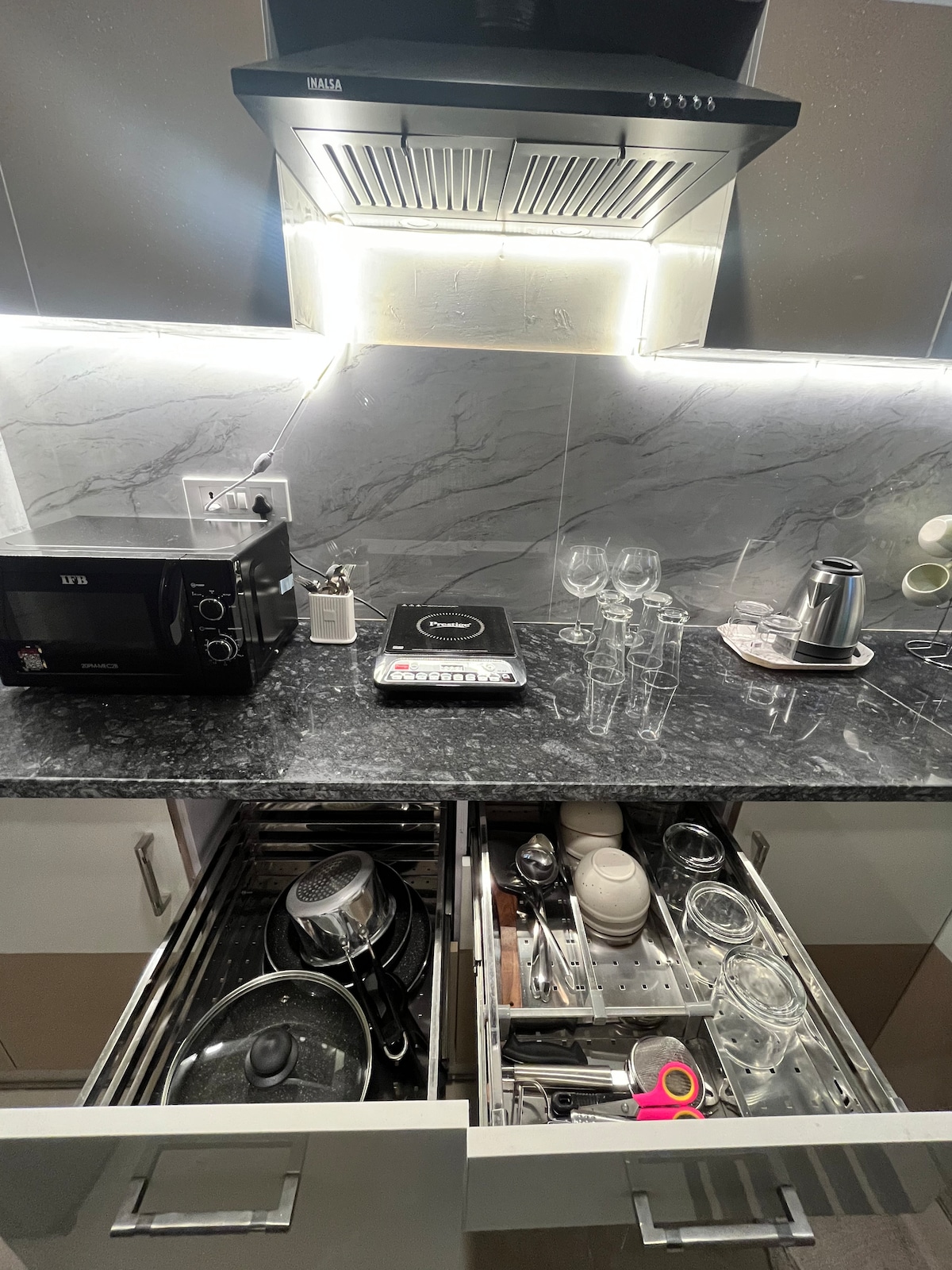 ➽ Spacious 1BHK apartment with an attached patio, fully air-conditioned. All rooms have 1.5-ton ACs. ➽ Sun-facing property in a high-income neighborhood, three-side open, park-facing, and well-ventilated with ample natural light and fresh air. ➽ High-end projector with 25W soundbar and Amazon FireStick with OTT apps. ➽ Fully equipped kitchen with essentials for convenient cooking. ➽ Relax on the stunning private terrace patio with ambient lights and unique Foger system for cooling the patio