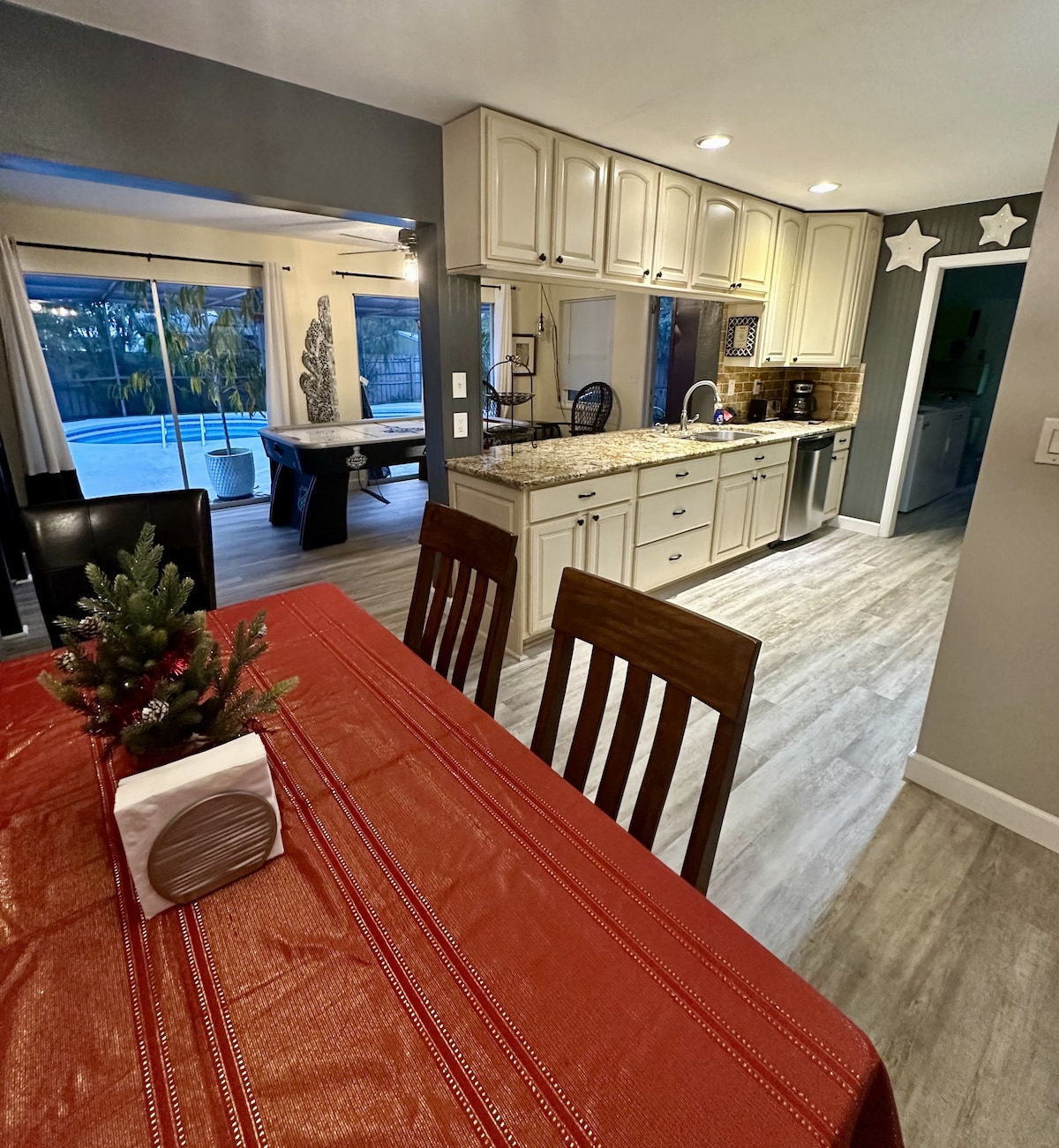 12 perc Siesta Key Beach-től!! Tökéletes, otthonos nyaraló csendes, barátságos környéken. Számos vásárlás/étterem központja. 1-király, 1queen, emeletes ágyak 1 teljes és 1-twinnal. Kutya- és macskabarát, nagy, privát kerítéssel körülvett udvarral és 1 nős kerékpárral. Léghokiasztal társasjátékokkal és medencés játékokkal. Teljesen feltöltött konyha és W/D. Tágas élet nagy szekcionált székkel, hintaszékkel és minden hálószobával, TV-vel és ingyenes Netflix-szel és Huluval. Már nagyon várjuk, hogy vendégül láthassunk! Küldj üzenetet bármikor, ha kérdésed van.