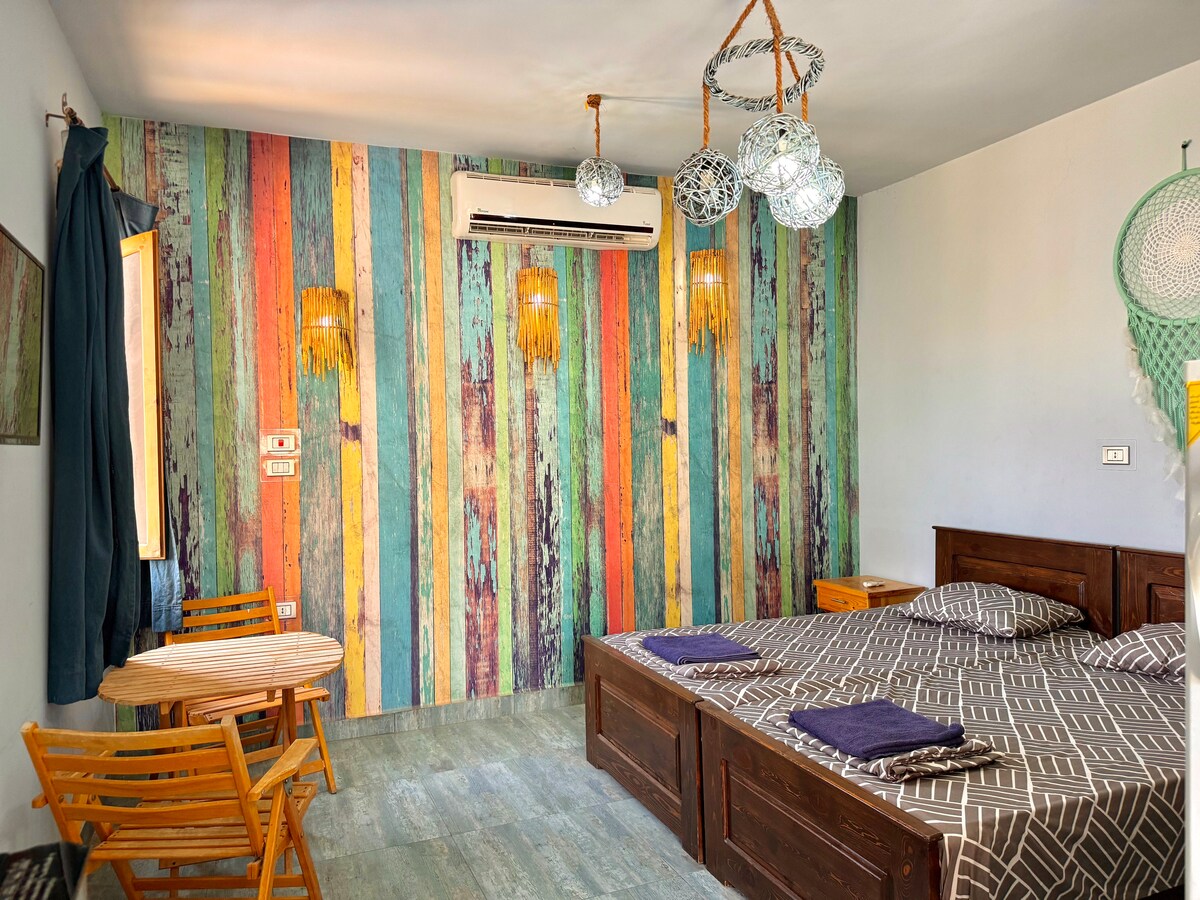 Üdvözöllek a hangulatos otthonodban Dahabban! Az első emeleten található „tengerre” néző lakásból gyönyörű kilátás nyílik a tengerre a pálmaágak és a napsugarak között, ahogy a képen is látható. Ez a tágas, egy hálószobás lakás tele van kézzel készített bútorokkal és kiegészítőkkel, amelyek tükrözik a Dahabban szeretett organikus és természetes életmódot. A második sorban, közvetlenül a strand mellett található, mindössze 3 perc sétára az Assala piactól és 10 perc sétára a világítótoronytól.