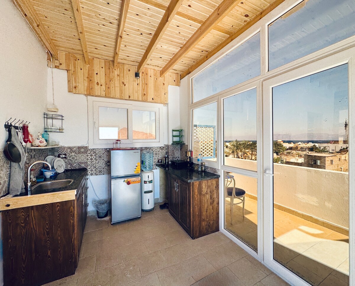 Located on our rooftop, we proudly present a stunning, super-bright and panoramic 40m² studio. Fully air-conditioned, it features a fully-equipped kitchen, a comfortable 160cm bed, a dining/work table with a computer chair, a flat-screen TV and a high-quality BOSE sound system. Enjoy breathtaking views from the private terrace overlooking the mountains and the seaside from the private balcony. Our building, DAHAB WORLD, is situated in the heart of Asala center, & just 5-minute walk from the sea.
