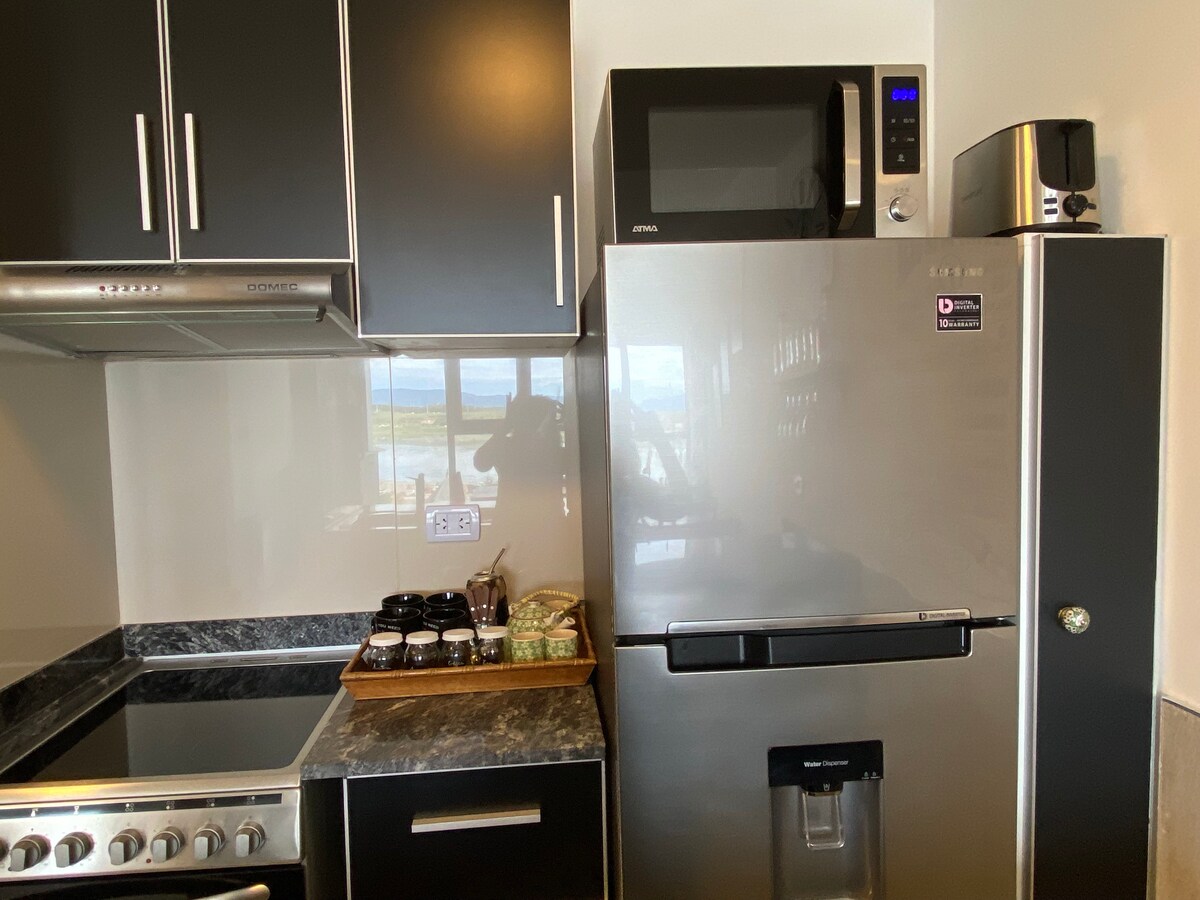 Disfrutá de la magnífica vista al Canal de Beagle en este alojamiento tranquilo y céntrico. Estudio moderno, para unas vacaciones soñadas en el fin del mundo! Desayuná en la cama con una vista inigualable al Canal de Beagle. Cocina integrada totalmente equipada, para una estadía independiente y completa! Además, lavarropas, televisión por cable y Wi-fi, que te permitirá compartir tus experiencias y aventuras con tus amigos y familiares.