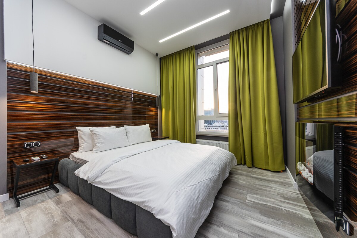 Ez a modern lakás minőségi anyagokból és átgondolásból áll minden részletben. Csendes környéken található, mégis pár lépésre a Pechersk látványosságaitól, kávézóktól és bároktól, egy nagy szupermarkettől, és közel van két nagy parkhoz, ahonnan festői kilátás nyílik a folyóra, és nagyszerű a reggeli kocogáshoz.