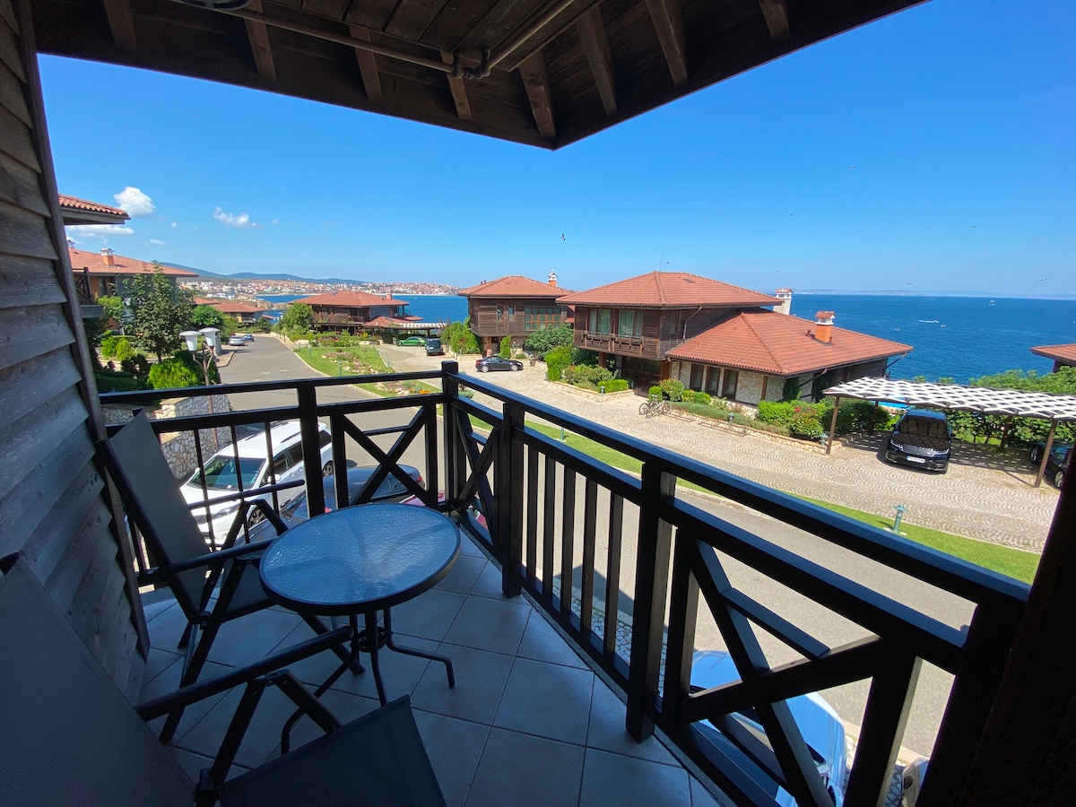 Santa Marina is a beautiful holiday village located near old town Sozopol. It is famous for its large and green territory. Our villa is the closest to tennis courts! Apartments are freshly renovated: ☑️smart TV ☑️comfortable terrace with a sea view and relax zone ☑️beach towels and kids toys ☑️coffee machine 🏖️5 large swimming pools with jacuzzi and 2 sand beaches 🍽️4 restaurants, pool bars and 2 mini markets 🎾6 modern tennis courts, football and volleyball field