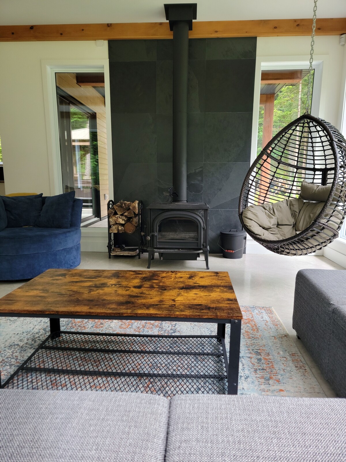 Monumental open concept, in the heart of nature. Access to trails directly behind the house. Wood stove, large modern bathroom, one bedroom + sofa bed. Another sofa bed in the living room. Ideal chalet for a couple with children or two couples. Wild birds, turkey, and deer lovers welcome! Wifi and EV charger included. Dogs Welcome! CITQ : #308038