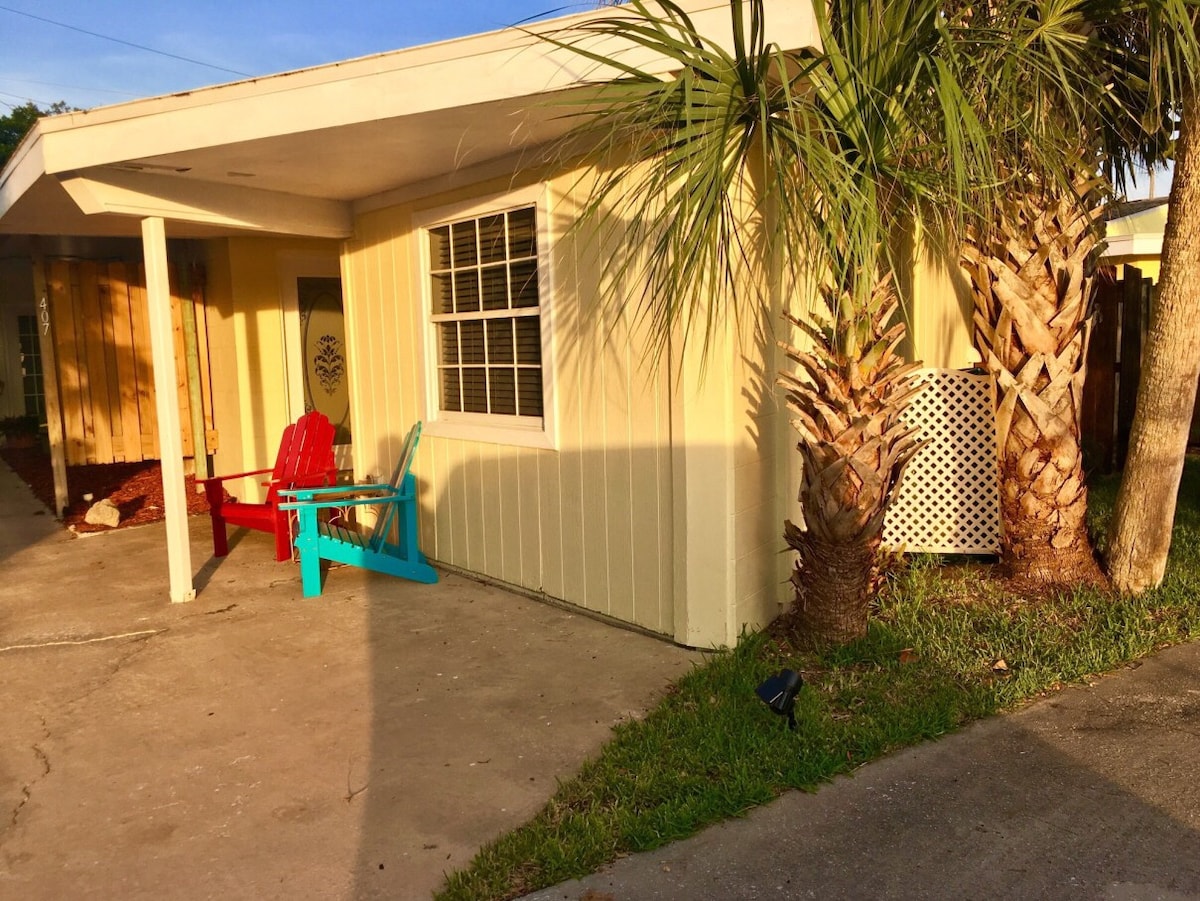 Our cozy cottage is the perfect place for a quiet romantic getaway, cruise ship stopover or the business traveler. It is nestled within a quiet community with a privately gated entrance and shaded yard. There are two parking spots for vehicles. It is half of a duplex home located 1 block from the beach with many nearby restaurants and shops. It is just 1.5 miles from the world famous Cocoa Beach Pier, 2.5 miles from Port Canaveral and less than 20 miles from Kennedy Space Visitors complex.
