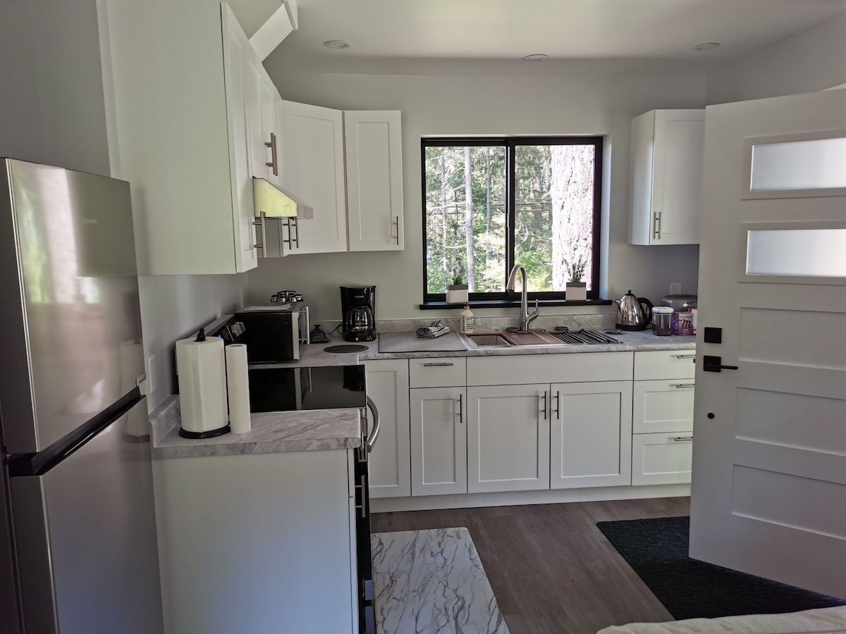 Hi! Newly built bright modernly furnished and designed 1 bedroom 700 sq ft Ocean view suite in beautiful Campbell River. Book here to relish in the luxuries found at the finest Resorts in complete privacy. Enjoy the walk in rain shower with heated floors. Relax by the gas fireplace watching Netflix. Want to get out and about? This easy location is minutes walk from the Sea Walk, Hospital, Campbell River Museum, public outdoor pool and across from a park.