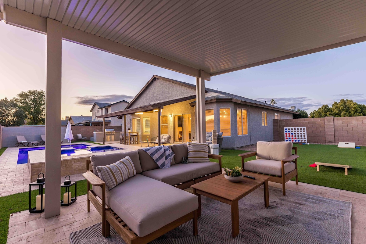 🏊 Egész évben pihenhet a fűtött sós vizű medencében és a gyógyfürdőben (kíméletes a bőrhöz/szemhez) 🔥 Hangulatos kandallós funkciók 🍳 Teljesen felszerelt konyha + kültéri propán BBQ grill 🎱 Játékterem biliárdasztallal, csocsóval, darts-szal és nagy képernyős tévével 🌞 Kültéri étkező és bár, hogy élvezhessük az időjárást 📺 Kültéri tévé a meccsekhez/filmekhez, miközben a gyógyfürdőben pihensz 🚗 Könnyen megközelíthető 2 fő autópálya 🎨 Művészi és egyedi dekoráció Üdülőhelyi kikapcsolódás Phoenixben (Glendale levelezés) – tökéletes családoknak, golfutazásokhoz és nyaralásokhoz