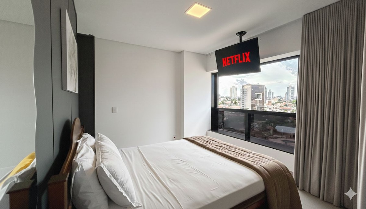 Nagyon kényelmes és praktikus Campo Grande legjobb régiójában. Az Afonso Pena Avenue és a Campo Grande bevásárlóközpont közelében található. A stúdió légkondicionálóval, luxus queen méretű ággyal, 55'-es TV-vel, Netflix-szel és Amazonnal, konyhával, kétszemélyes kanapéval és sötétítőfüggönyökkel rendelkezik. Van kiságy vagy extra matrac. Vannak lehetőségeink romantikus dekorációs csomagokra. A Vertigo Premium Studiosban hozzáférhetsz a Szépségszalonhoz, a Szaunához, a Fűtött medencéhez és az Infinite Edge-hez.