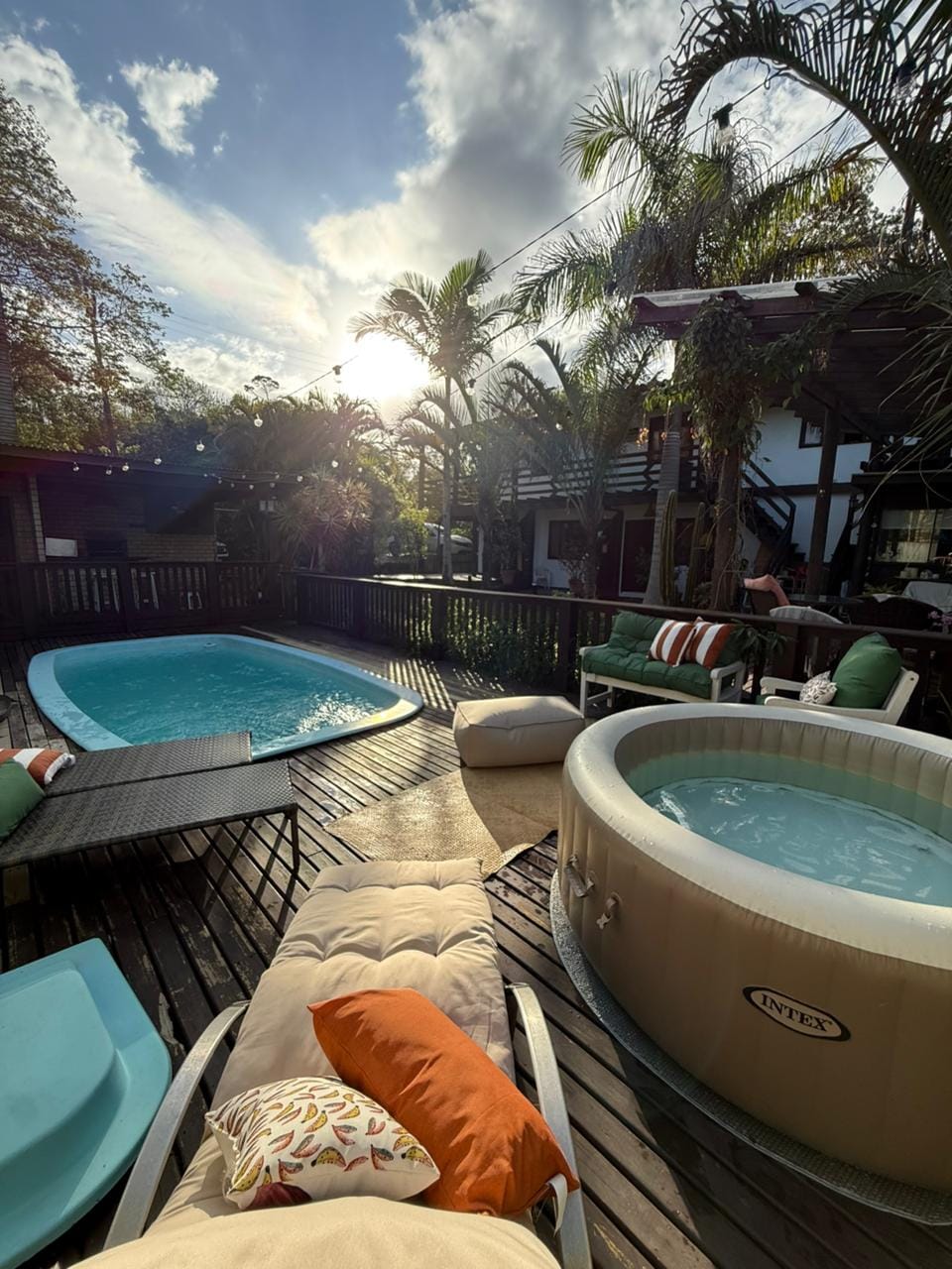 A ház egy bájos, csendes erdőben található, és rejtve van a nyüzsgéstől, ahol abban a megtiszteltetésben lehet részünk, hogy hallgathatjuk a régió madarainak kellemes hangját, a körülötte lévő természetet és a tengerre nyíló gyönyörű kilátást. Azok számára, akik szeretnek remegni, csak menj a Lagoa da Conceição-ba. A háztól 50 méterre található egy piac, egy kiváló pékség, éttermek ebédre és vacsorára, pizzériák, még inkább vannak büfékocsik élőzenével és játszótérrel, benzinkúttal, bankokkal.