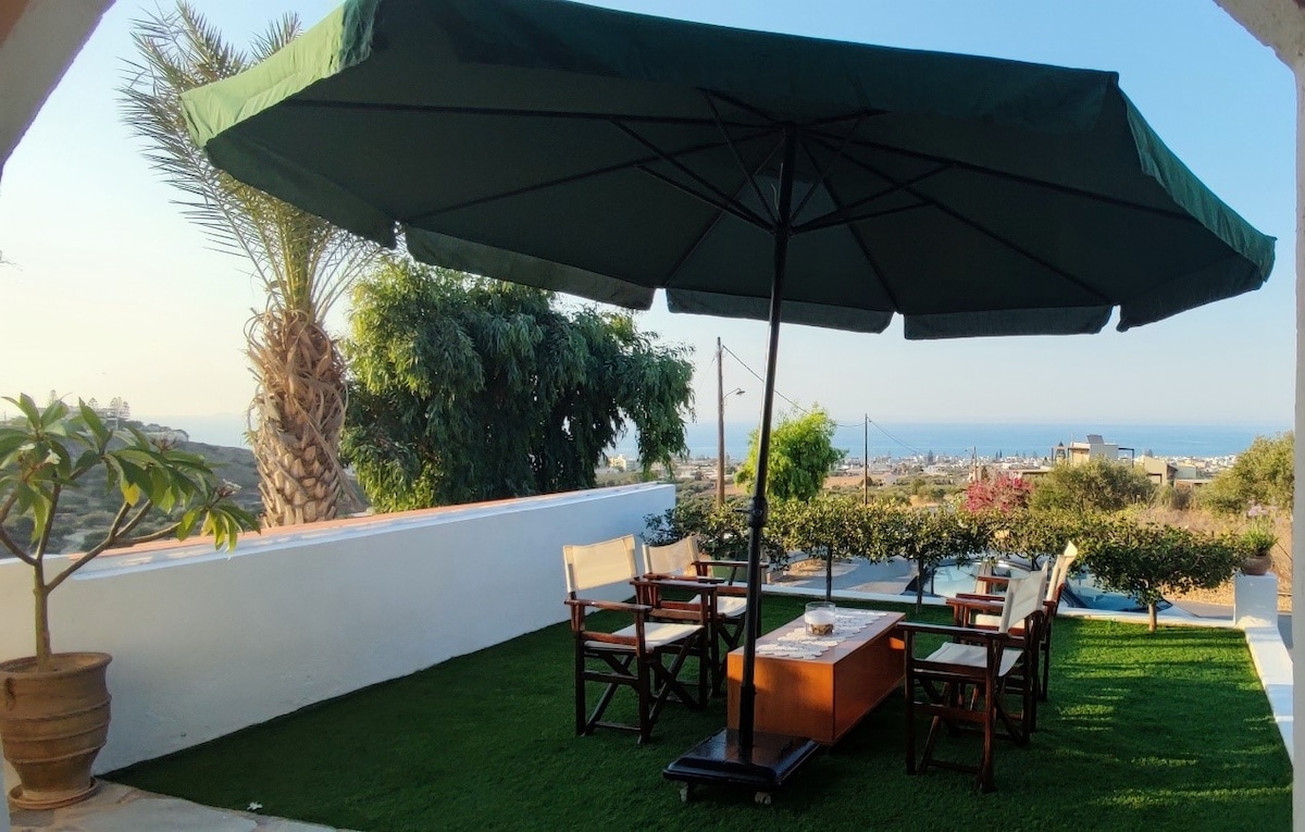 Üdvözlünk a Színes Álmok Házában. Színek és fény szentélye egy 2000 m²-es telken, ahol olajfák és virágok táncolnak a szellőben. Egész évben természetes fényben úszik, és arra hív, hogy nyugodtan pihenj vagy dolgozz. A kerttől a hegyig és a horizonton átívelő tengerig minden pillanat a nyugalom és a felejthetetlen emlékek meghívása. Autóval mindössze 5 percre találsz aranyszínű strandokat, hagyományos tavernákat és kávézókat, ahol kiélvezheted a helyi életet.