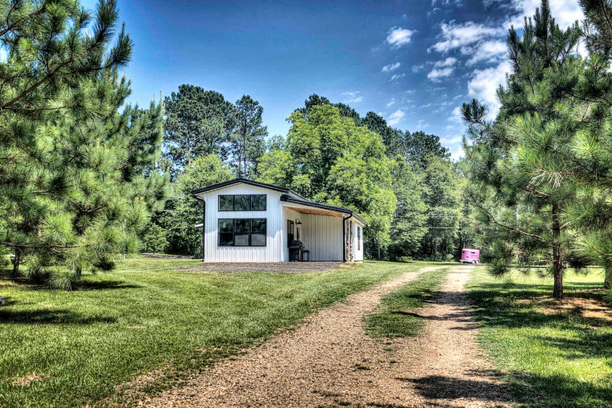 Unwind in this modern cabin where nature meets comfort. Enjoy an interactive experience with friendly farm animals eager for pets and treats. Soak in views of the serene pond, grazing cows, and horses. Explore trails on secluded acreage. Light-filtering blinds, AC, and Starlink WiFi. Built in 2023. We have piggies, mini goats, cows, horses, donkeys, and a black lab to say hello to Close to Circuit of the Americas, Bastrop, Austin Airport, and Smithville.