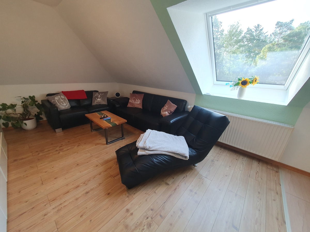 Az apartman egy kétcsaládos ház legfelső szintjén található Hamburg külvárosában, és egy külön bejáraton keresztül érhető el. A lakásban, alig 70m² -es - Zuhanyzó - Konyha - Nappali nagy étkezővel, amely is használható, mint a munkaterület - 2 hálószoba - erkély - Wi-Fi