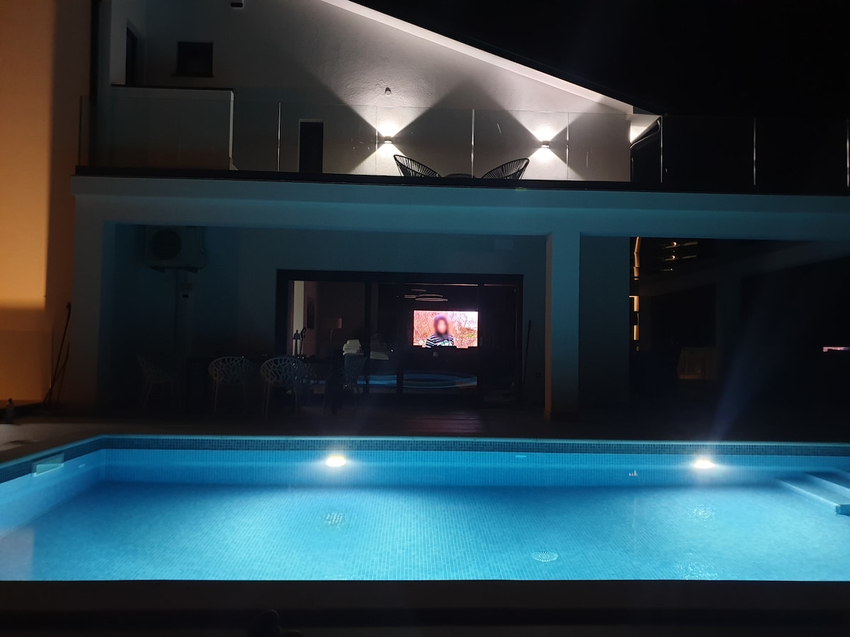 Opustite se u ovom ugodnom i luksuzno uređenom smještaju. Na raspolaganju su vam 4 sobe sa 4 kupaone,svaka soba je klimatizirana ,veliki dnevni boravak sa kuhinjom i toaletom. Kuhinja je moderna i ima sve aparate. Nalazimo se u mjestu Krsan,malo mjesto kraj Labina. U samom mjestu na 500metara imate trgovinu,caffe bar,restaurant. Posteljina i ciscenje su ukljuceni u cijenu.. Bazen nema grijanje..