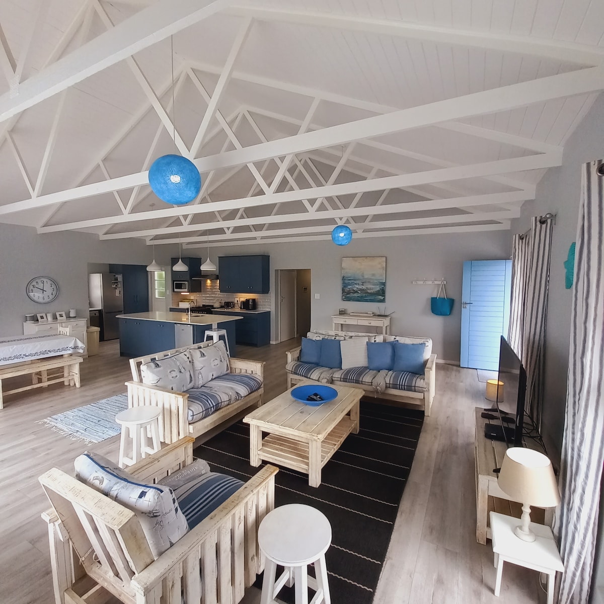 The Blue Beach House is a bright and spacious property decorated in a blue and white coastal theme. In a peaceful neighborhood comprising of mostly holiday homes, it has views of the river 50 meters away. A wide deck with a braai envelopes the living area on two sides. The unlimited fibre internet means the house is great for home working. The garden is enclosed and ideal for kids. Outdoors you can choose between the river walk, calm river beach, rock pools, coastal walk or several beaches.