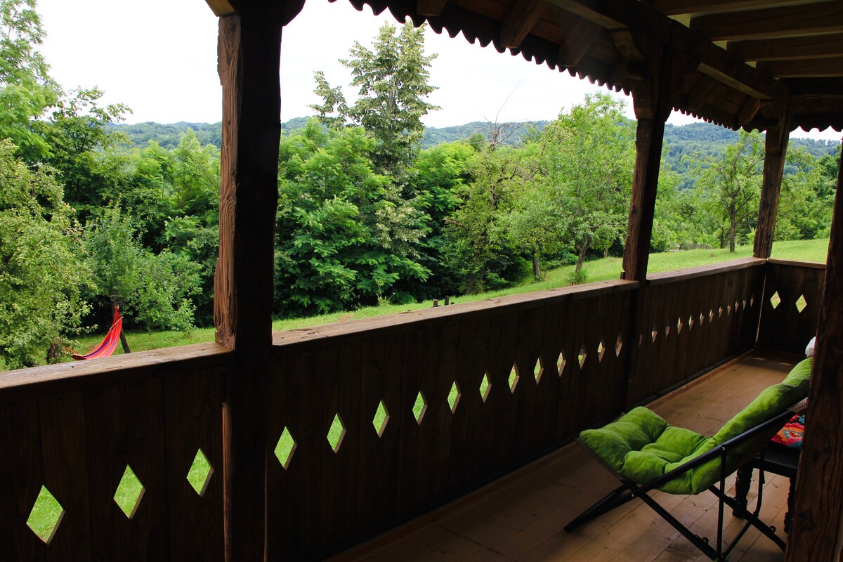 A víkendház egy távoli, csendes helyen található, amely tökéletes a természet szerelmeseinek. Egy fán épült, és kilátás nyílik a Făgăraș-hegység déli részére. Nincs áram, de van napelemes fotovoltaikus rendszerünk. Nincs folyó vizünk, nincs fürdőszobánk, de van komposztáló vécénk és közös zuhanyzónk, így közelebb érezheted magad a természethez. Készíthetsz grillezőt, tábortüzet, pihenhetsz a függőágyban, hosszú sétákat tehetsz, és élvezheted a csendet. Háziállataink örömmel játszanak veled