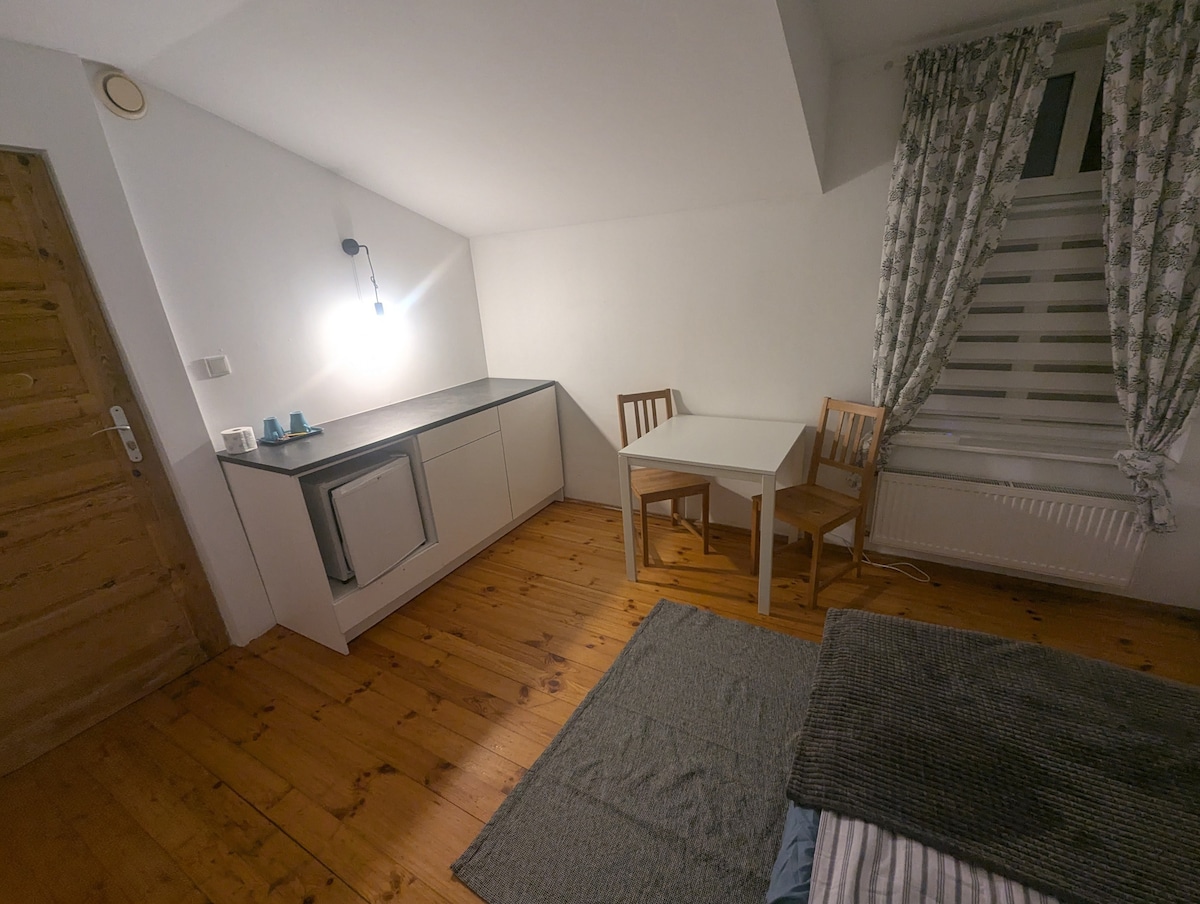 Gdańsk, Óváros. Tágas, egy szobás, modern lakás teakonyhával és fürdőszobával, egy bérház harmadik emeletén található, a Szent Mária Bazilika közelében. Felújított lakás, elektromos tűzhellyel, hűtőszekrénnyel, elektromos vízforralóval, evőeszközökkel, edényekkel felszerelt konyha. A fürdőszobában zuhanykabin, WC, mosógép. A szobában kényelmes kanapé, asztal, fotel, polcok és ruhaakasztók találhatók.