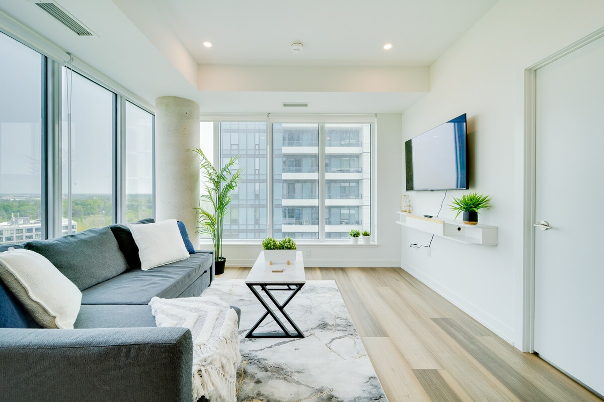 Üdvözlünk a városra nyíló kilátást nyújtó, nyitott koncepciójú toronyházban Kitchener-Waterloo szívében, ahol a stílus és a kényelem találkozik, hogy igazán emlékezetes tartózkodást biztosítson. Ez az 1 hálószobás, nyitott koncepciójú egység átgondoltan úgy van kialakítva, hogy akár 4 vendég elszállásolására is alkalmas legyen, így tökéletes pároknak, kis családoknak vagy egyedül utazóknak, akik modern és otthonos menedéket keresnek. ✔ Teljesen felszerelt konyha ✔ Kényelmes hálószoba franciaággyal ✔ Open Concept Living Area ✔ Nagy sebességű Wi-Fi ✔ ✔️Ingyenes parkolási lehetőség edzőterembe Tudj meg többet alább!